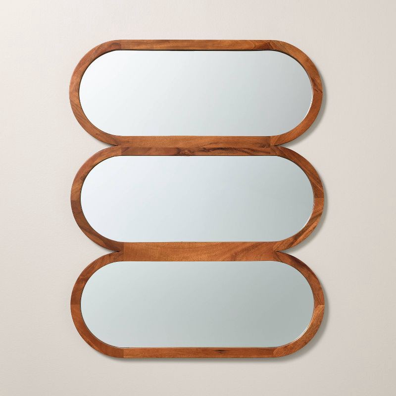This Wood Framed Triple Oval Mirror from Hearth & Hand™ with Magnolia is a practical and stylish addition to your home decor. It features three oval-shaped mirrors attached side by side on a wooden fr…
