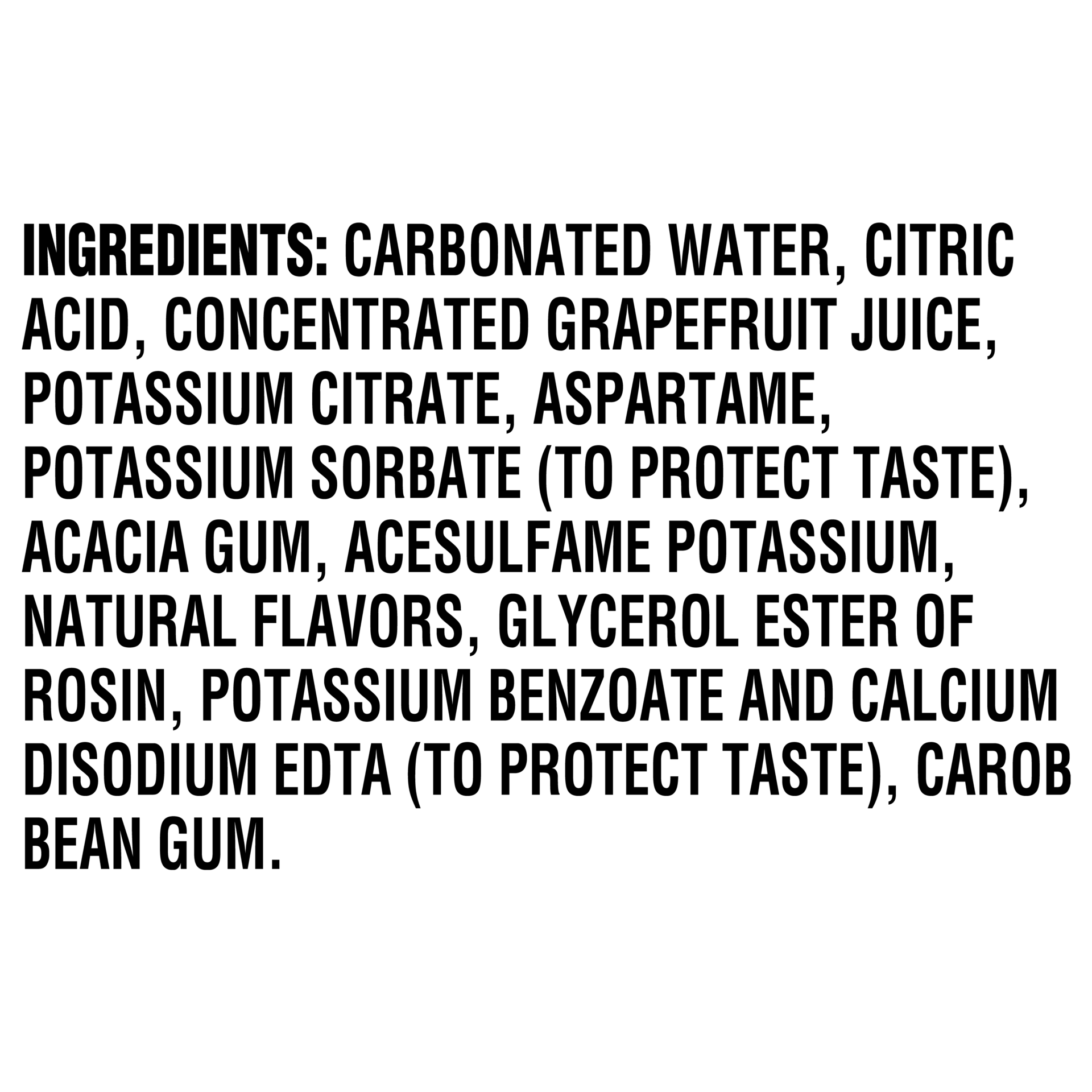 Carbonated Water, Citric Acid, Concentrated Grapefruit Juice, Potassium Citrate, Aspartame, Potassium Sorbate (to Protect Taste), Acacia Gum, Acesulfame Potassium, Natural Flavors, Glycerol Ester of R…