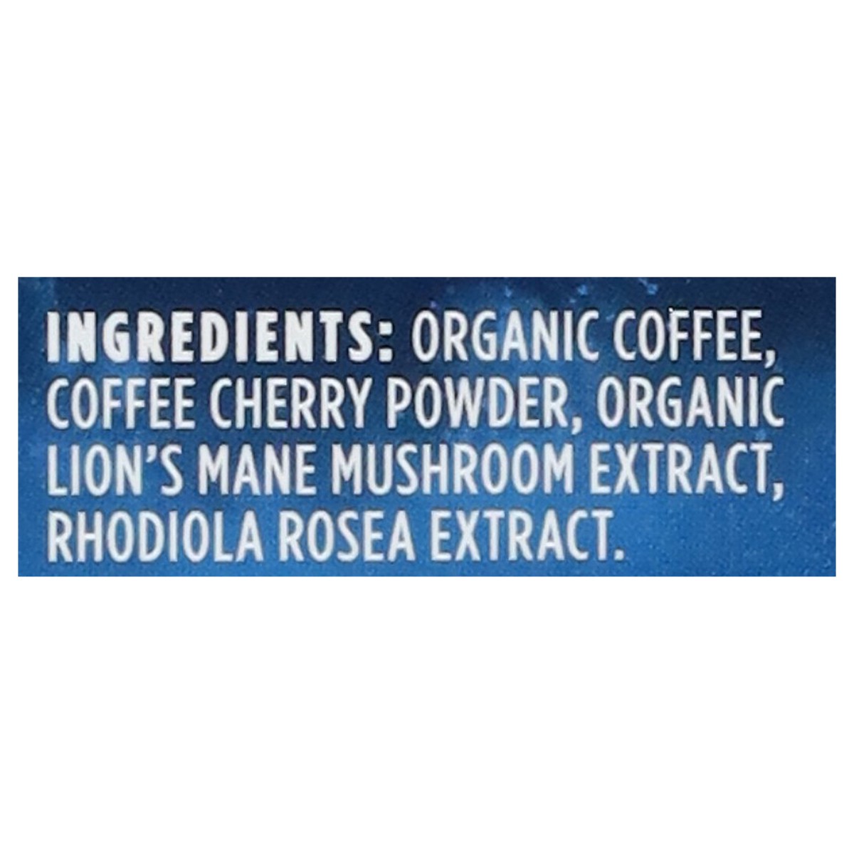 Organic Coffee, Coffee Cherry Powder, Organic Lion's Mane Mushroom Extract, Rhodiola Rosea Extract.