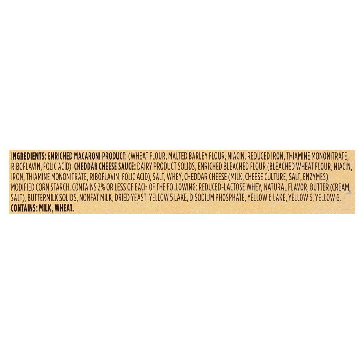 Enriched Macaroni Product: (Wheat Flour, Malted Barley Flour, Niacin, Reduced Iron, Thiamine Mononitrate, Riboflavin, Folic Acid), Cheddar Cheese Sauce: Dairy Product Solids, Enriched Bleached Flour (…