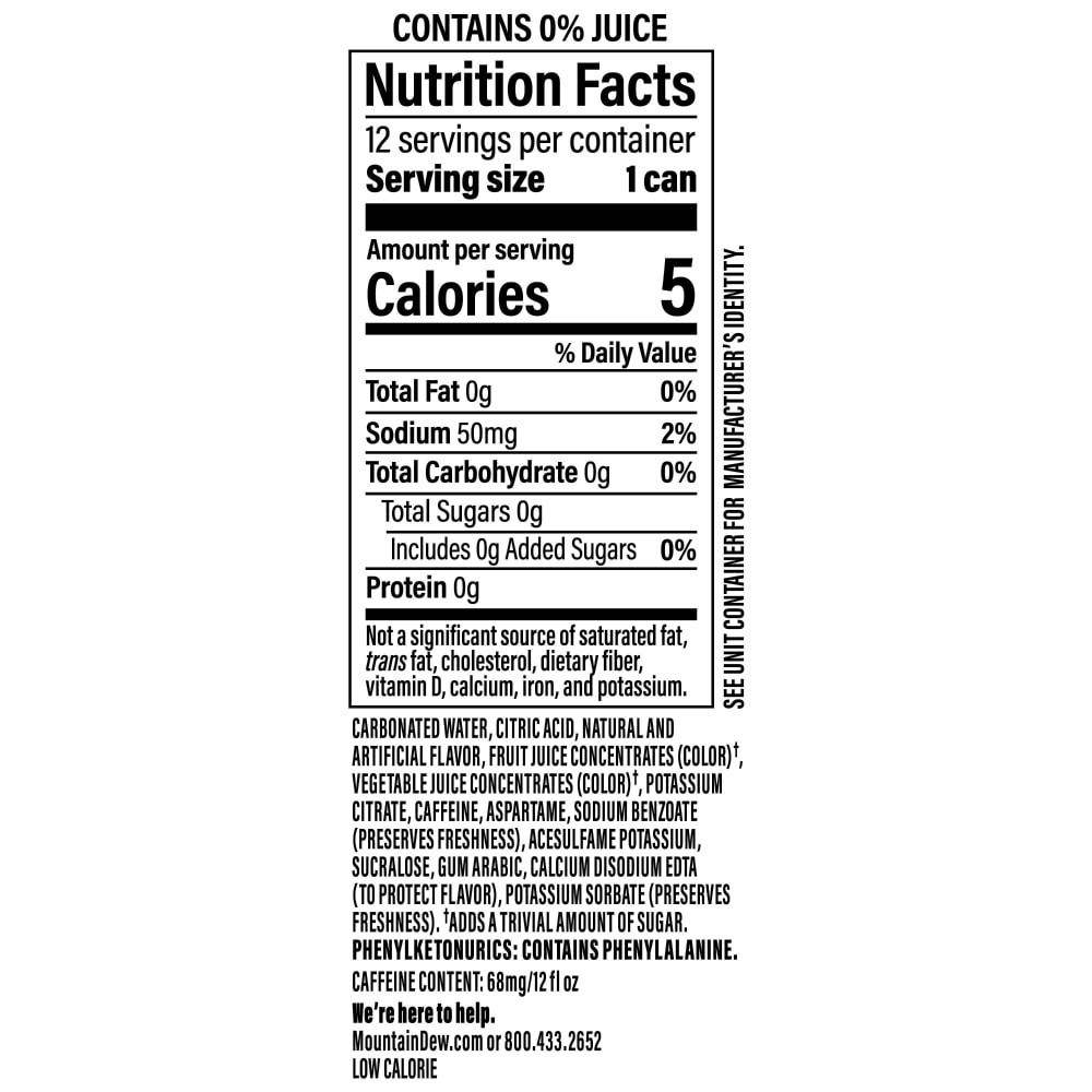 Carbonated Water, Citric Acid, Natural and Artificial Flavor, Fruit Juice Concentrates (Color) (a), Vegetable Juice Concentrates (Color) (a), Potassium Citrate, Caffeine, Aspartame, Sodium Benzoate (P…
