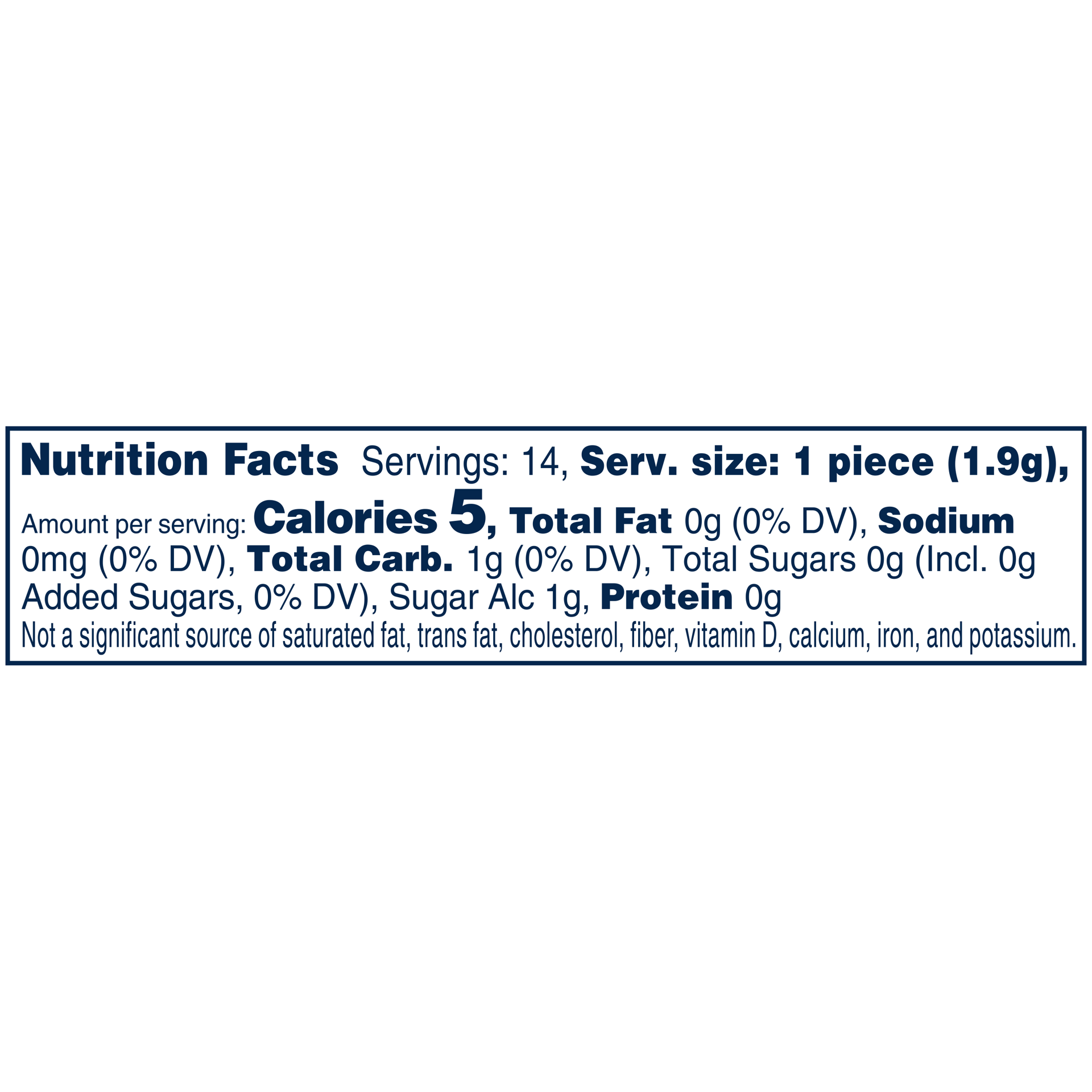 SORBITOL, GUM BASE, GLYCEROL, MANNITOL, NATURAL AND ARTIFICIAL FLAVORS; LESS THAN 2% OF: HYDROGENATED STARCH HYDROLYSATE, ASPARTAME, ACESULFAME K, SOY LECITHIN, XYLITOL, BHT (TO MAINTAIN FRESHNESS).