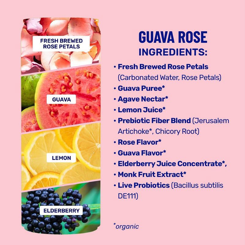 Fresh Brewed Rose Petals (Filtered Water, Rose Petals), Guava Puree*, Agave Nectar*, Lemon Juice*, Jerusalem Artichoke*, Rose Flavor*, Chicory Root Inulin, Guava Flavor*, Elderberry Juice Concentrate*…