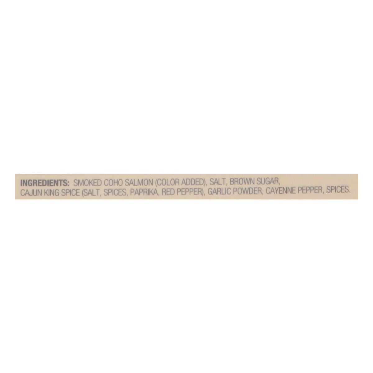 Smoked Coho Salmon (Color Added), Salt, Brown Sugar, Cajun King Spice (Salt, Spices, Paprika, Red Pepper), Garlic Powder, Cayenne Pepper, Spices.