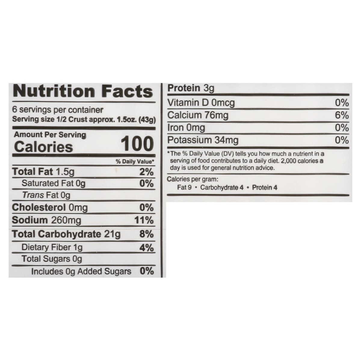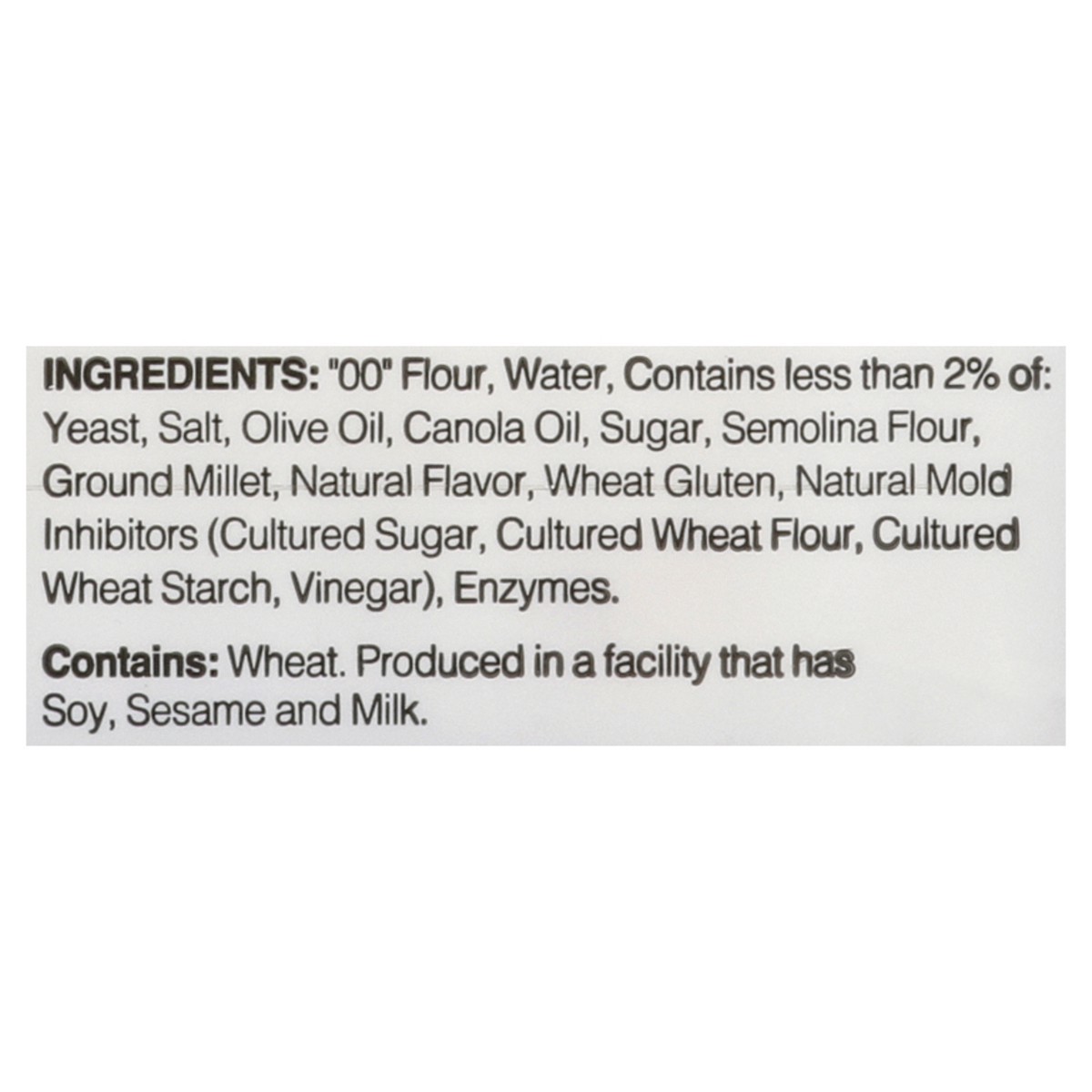 00 Flour, Water, Contains less than 2% of: Yeast, Salt, Olive Oil, Canola Oil, Sugar, Semolina Flour, Ground Millet, Natural Flavor, Wheat Gluten, Natural Mold Inhibitors (Cultured Sugar, Cultured Whe…