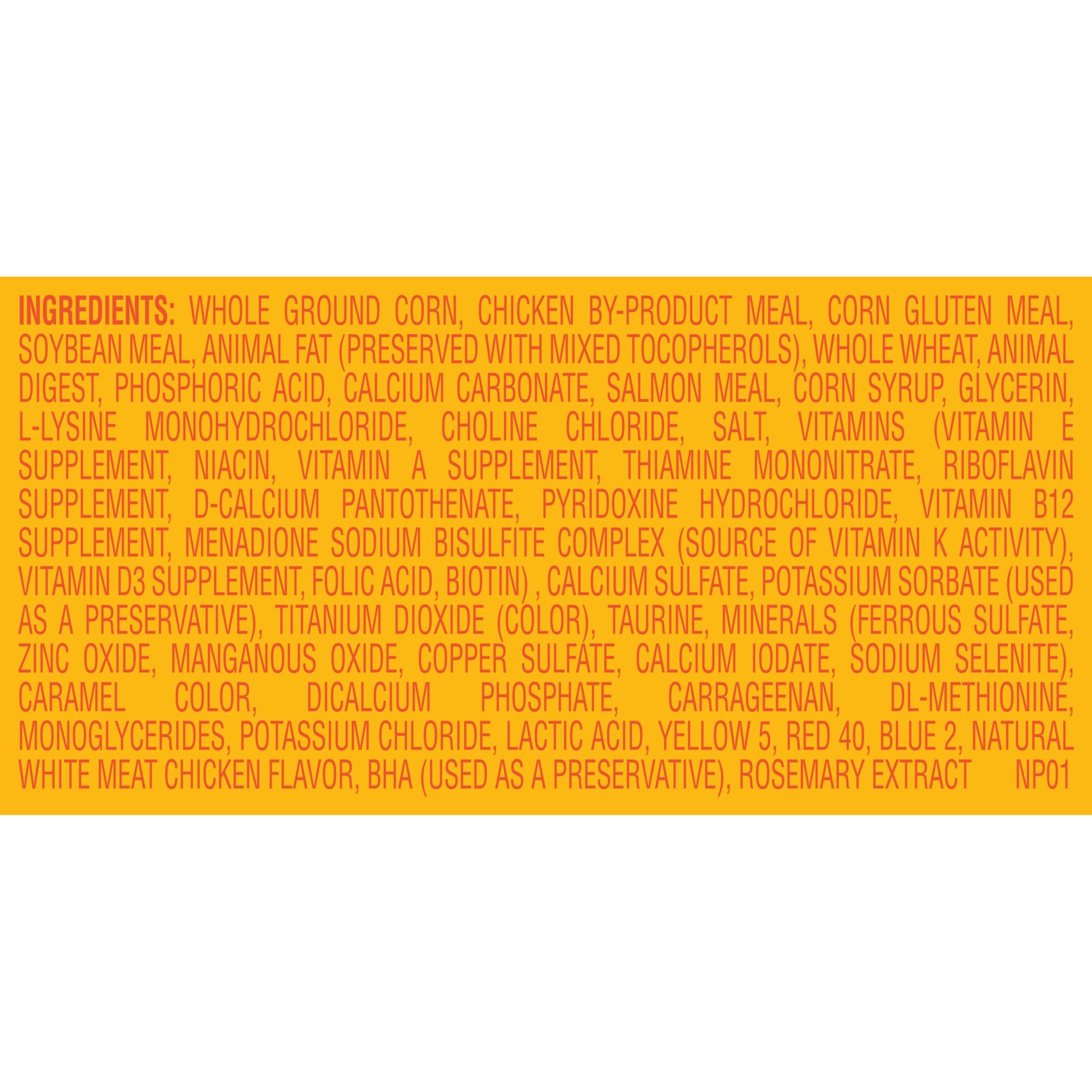 Ground Corn, Soybean Meal, Chicken By-Product Meal, Corn Protein Meal, Beef Tallow (Mixed Tocopherols Used As A Preservative), Whole Wheat, Natural Flavor, Calcium Carbonate, Salmon Meal, Phosphoric A…