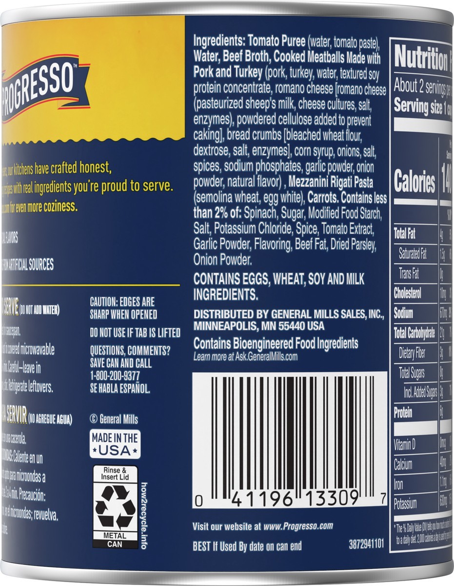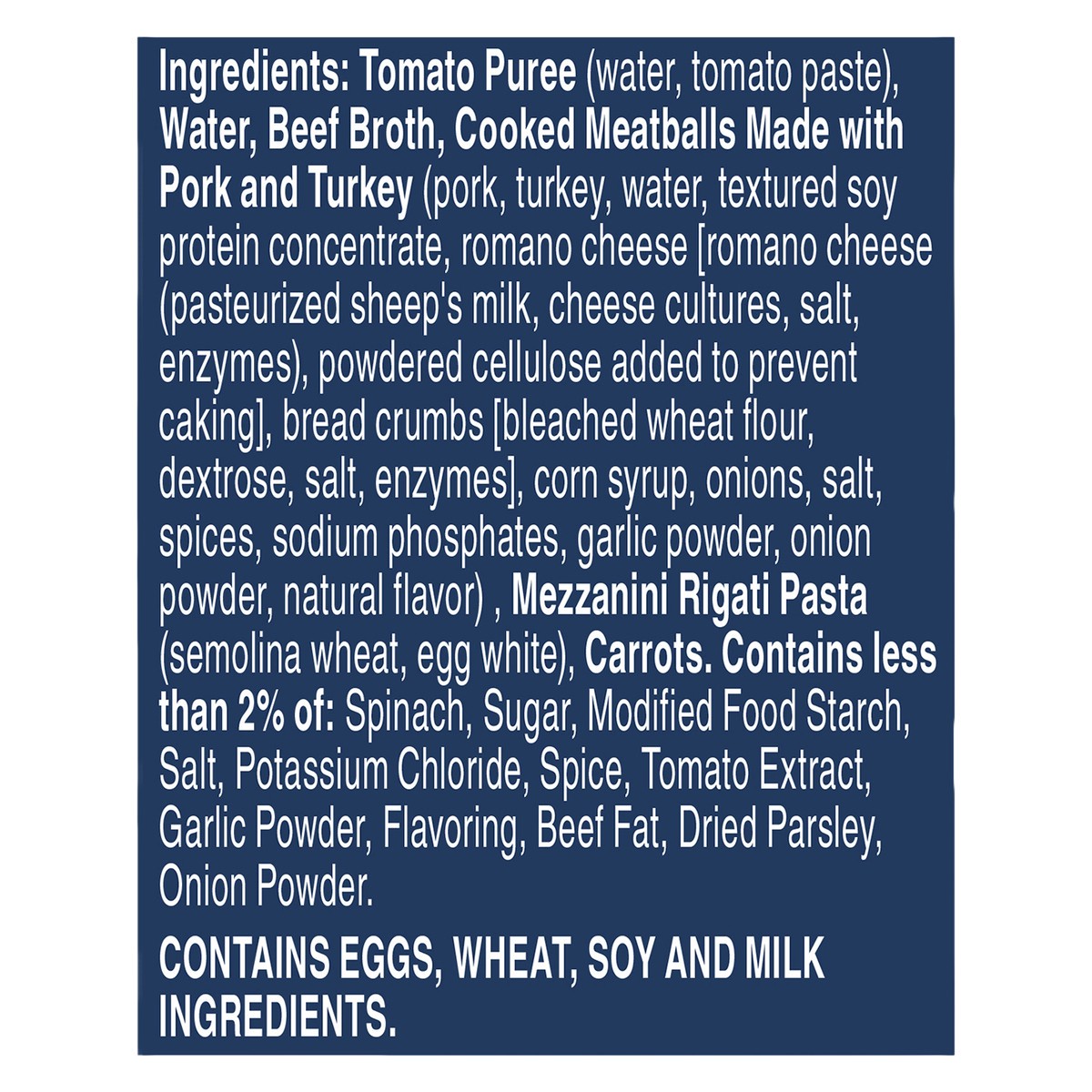 Tomato Puree (Water, Tomato Paste), Water, Beef Broth, Cooked Meatballs Made with Pork and Turkey (Pork, Turkey, Water, Textured Soy Protein Concentrate, Romano Cheese [Romano Cheese (Pasteurized Shee…