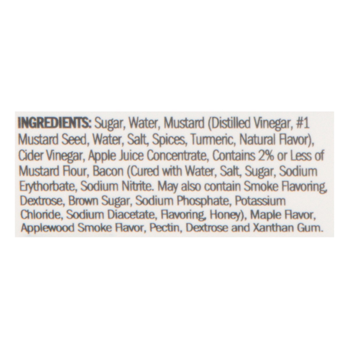 Sugar, Water, Mustard (Distilled Vinegar, #1 Mustard Seed, Water, Salt, Spices, Turmeric, Natural Favor), Cider Vinegar, Apple Juice Concentrate, Contains 2% or Less of Mustard Flour, Bacon (Cured wit…