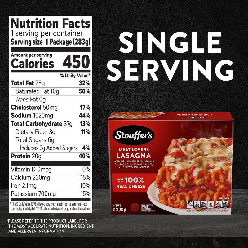 - DELICIOUS BITES FOR SOLO NIGHTS: You’ll love every bite of Stouffer’s Single Serve Meat Lovers Lasagna. Make any dinnertime a joyful moment with homestyle food