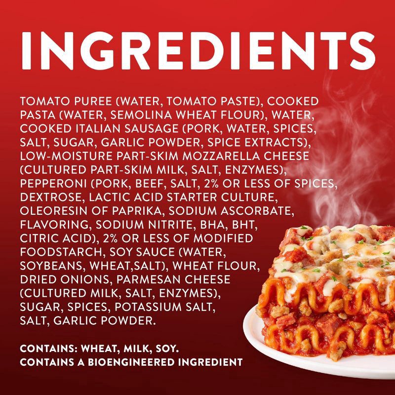 Tomato Puree (Water, Tomato Paste), Cooked Pasta (Water, Semolina Wheat Flour), Water, Cooked Italian Sausage (Pork, Water, Spices, Salt, Sugar, Garlic Powder, Spice Extracts), Low-Moisture Part-Skim …