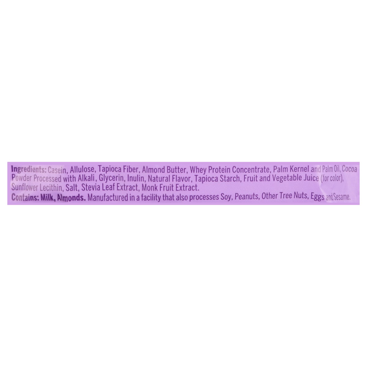 Casein, Allulose, Tapioca Fiber, Almond Butter, Whey Protein Concentrate, Palm Kernel and Palm Oil, Cocoa Powder Processed with Alkali, Glycerin, Inulin, Natural Flavor, Tapioca Starch, Fruit and Vege…