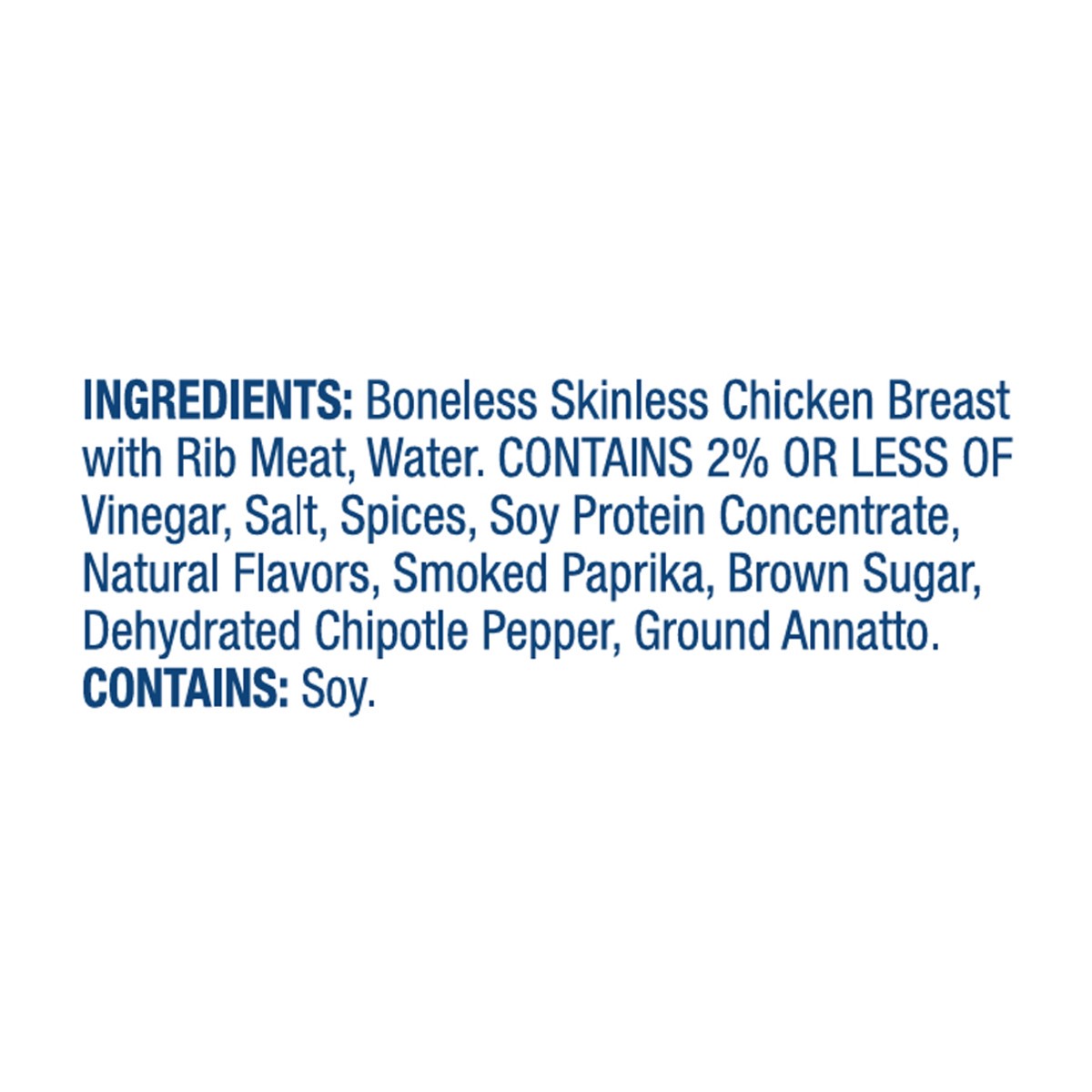 Boneless Skinless Chicken Breast with Rib Meat, Water. Contains 2% or Less of Vinegar, Salt, Spices, Soy Protein Concentrate, Natural Flavors, Smoked Paprika, Brown Sugar, Dehydrated Chipotle Pepper, …