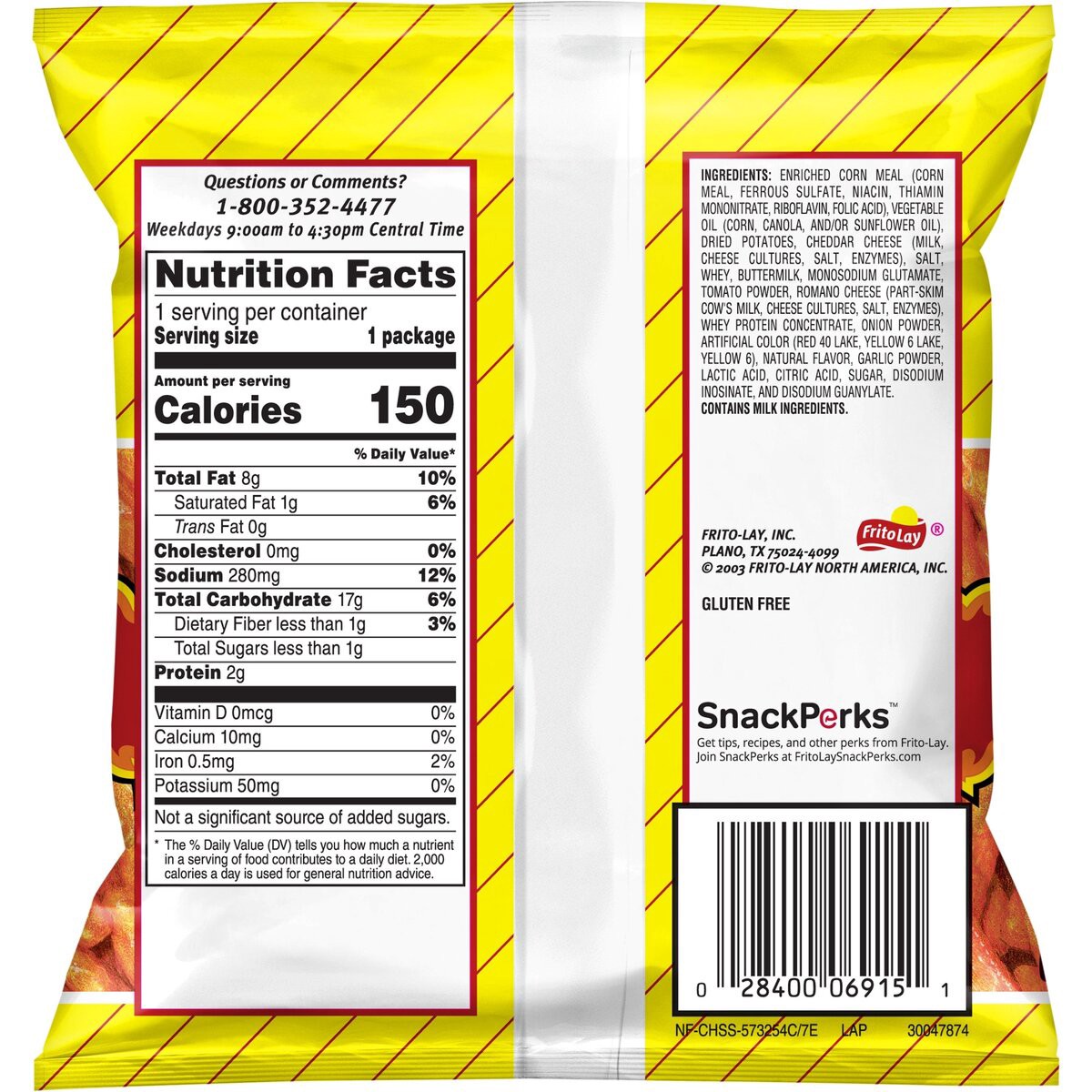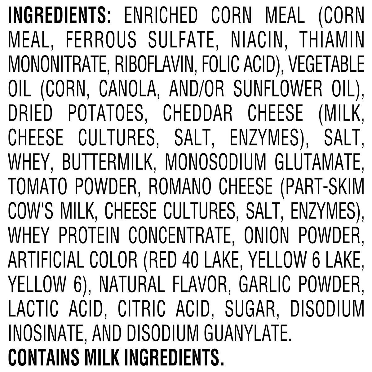 Enriched Corn Meal (Corn Meal, Ferrous Sulfate, Niacin, Thiamin Mononitrate, Riboflavin, Folic Acid), Vegetable Oil (Corn, Canola, and/or Sunflower Oil), Salt, Whey, Maltodextrin (Made from Corn), But…