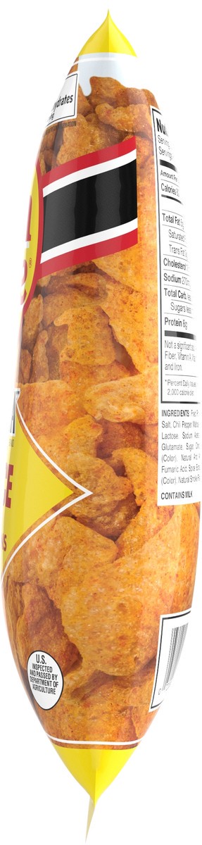 Fried Pork Skins, Whey, Salt, Chili Pepper, Maltodextrin, Malic Acid, Lactose, Sodium Acetate, Monosodium Glutamate, Sugar, Citric Acid, Paprika (Color), Natural and Artificial Flavors, Fumaric Acid, …