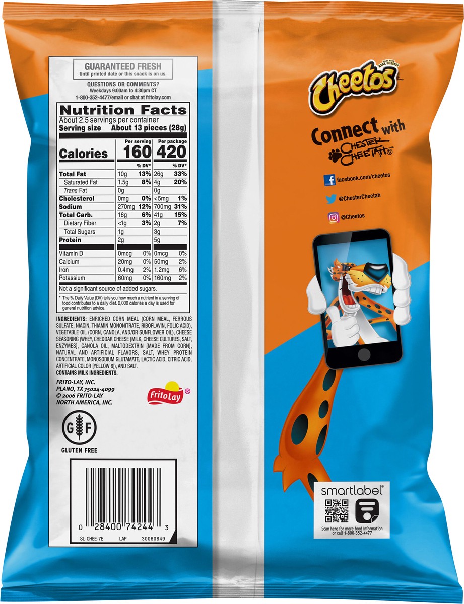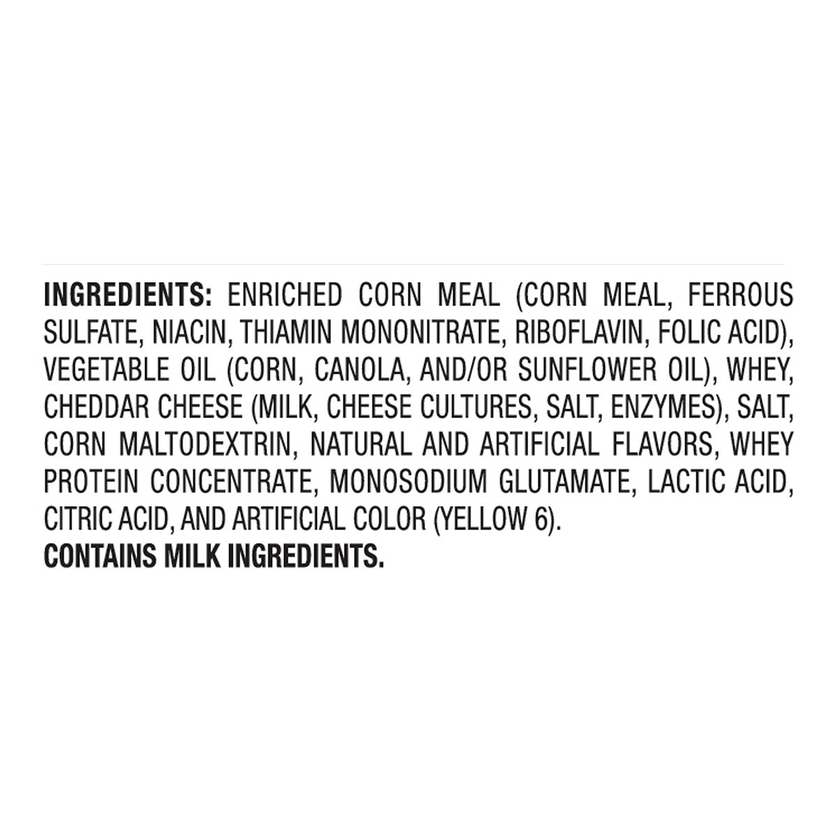 Enriched Corn Meal (Corn Meal, Ferrous Sulfate, Niacin, Thiamin Mononitrate, Riboflavin, Folic Acid), Vegetable Oil (Corn, Canola, and/or Sunflower Oil), Cheese Seasoning (Whey, Cheddar Cheese [Milk, …