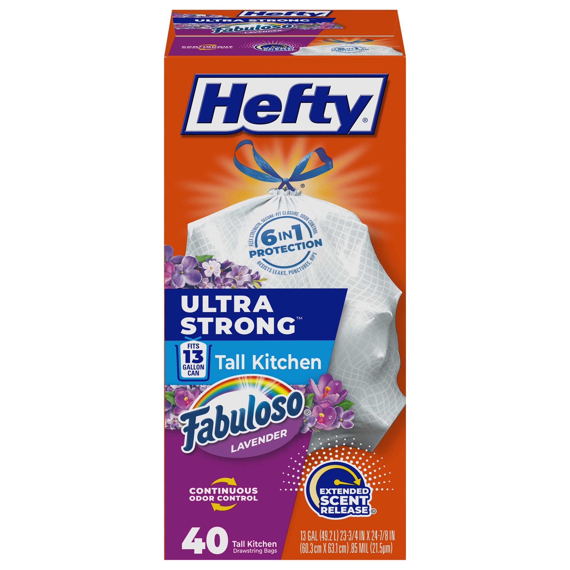 13 Gallon Tall Kitchen Garbage Bags—This package contains 40 Hefty Ultra Strong 13 Gallon Kitchen Trash Bags in White, Fabuloso scent. Toughness You Can Trust—Hefty's strongest tall kitchen garbage ba…