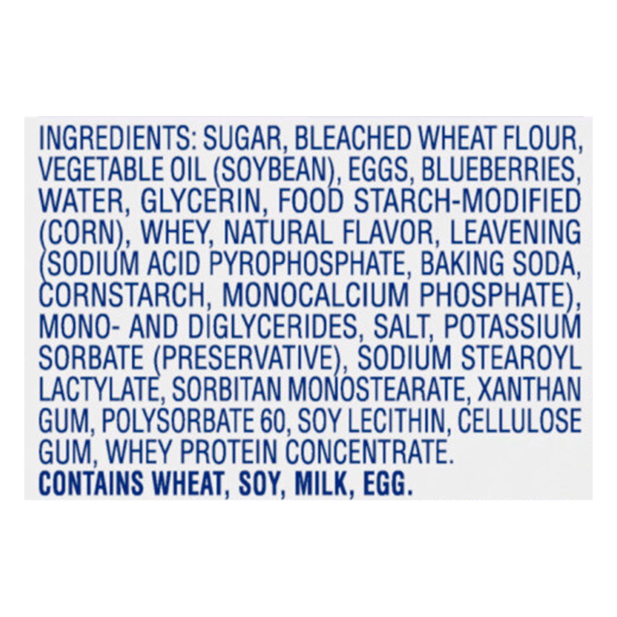 Sugar, Bleached Wheat Flour, Vegetable Oil (Soybean), Eggs, Blueberries, Water, Glycerin, Food Starch-Modified (Corn), Whey, Natural Flavor, Leavening [Sodium Acid Pyrophosphate, Baking Soda, Cornstar…