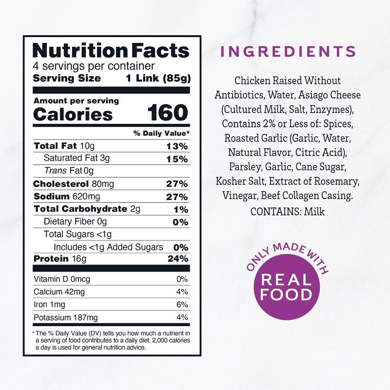 Chicken Raised without Antibiotics, Water, Asiago Cheese (Cultured Milk, Salt, Enzymes), Contains 2% or Less of: Spices, Roasted Garlic (Garlic, Water, Natural Flavor, Citric Acid), Parsley, Garlic, C…