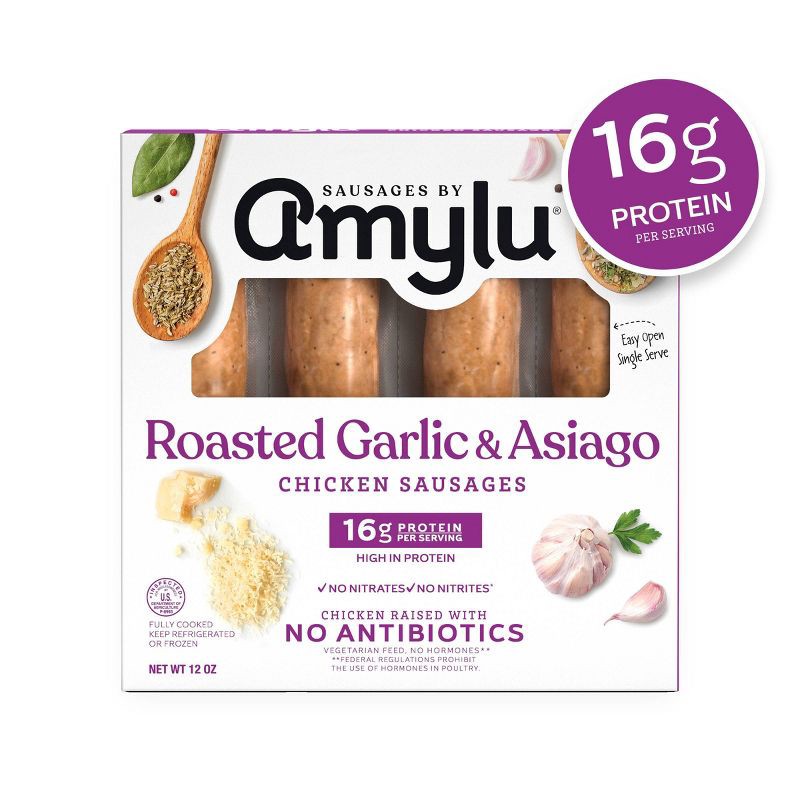 Enjoy the rich, savory taste of Amylu Foods Roasted Garlic & Asiago Chicken Sausages. Made with antibiotic-free chicken, these premium sausages are crafted with simple, high-quality ingredients and ar…
