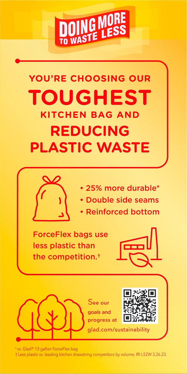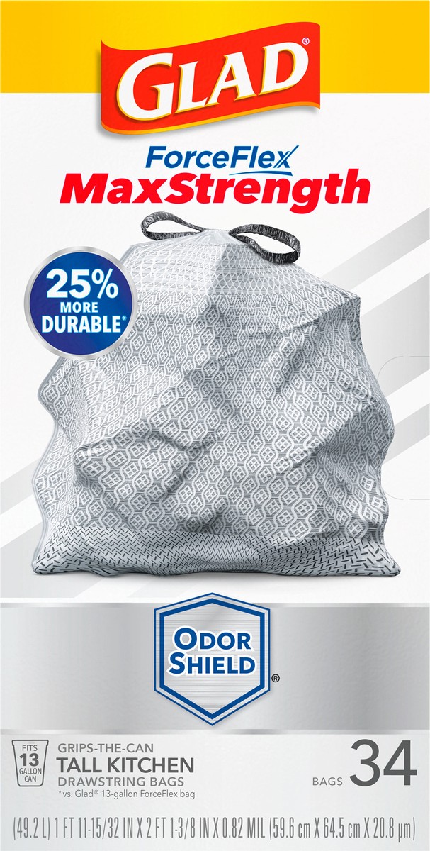 Glad ForceFlex MaxStrength Tall Kitchen Trash Bags provide strength and odor fighting technology to help your kitchen smell fresh. The strongest kitchen bag yet from Glad, this 13 gallon bag has a 2X …