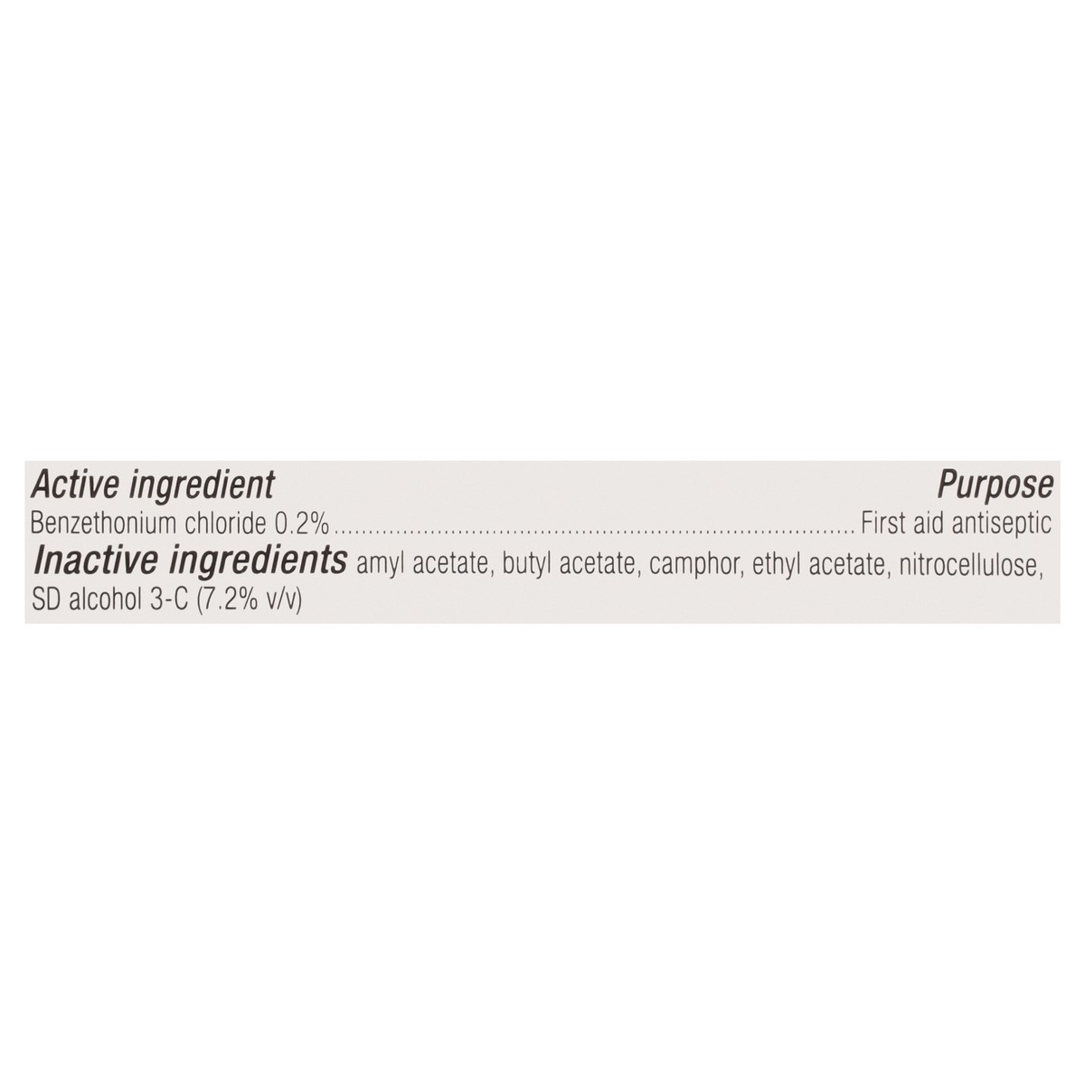 Active Ingredients: Benzethonium Chloride (0.2 %), First Aid Antiseptic. Inactive Ingredients: Amyl Acetate, Butyl Acetate, Camphor, Ethyl Acetate, Nitrocellulose, SD Alcohol 3-C (7.2% v/v).