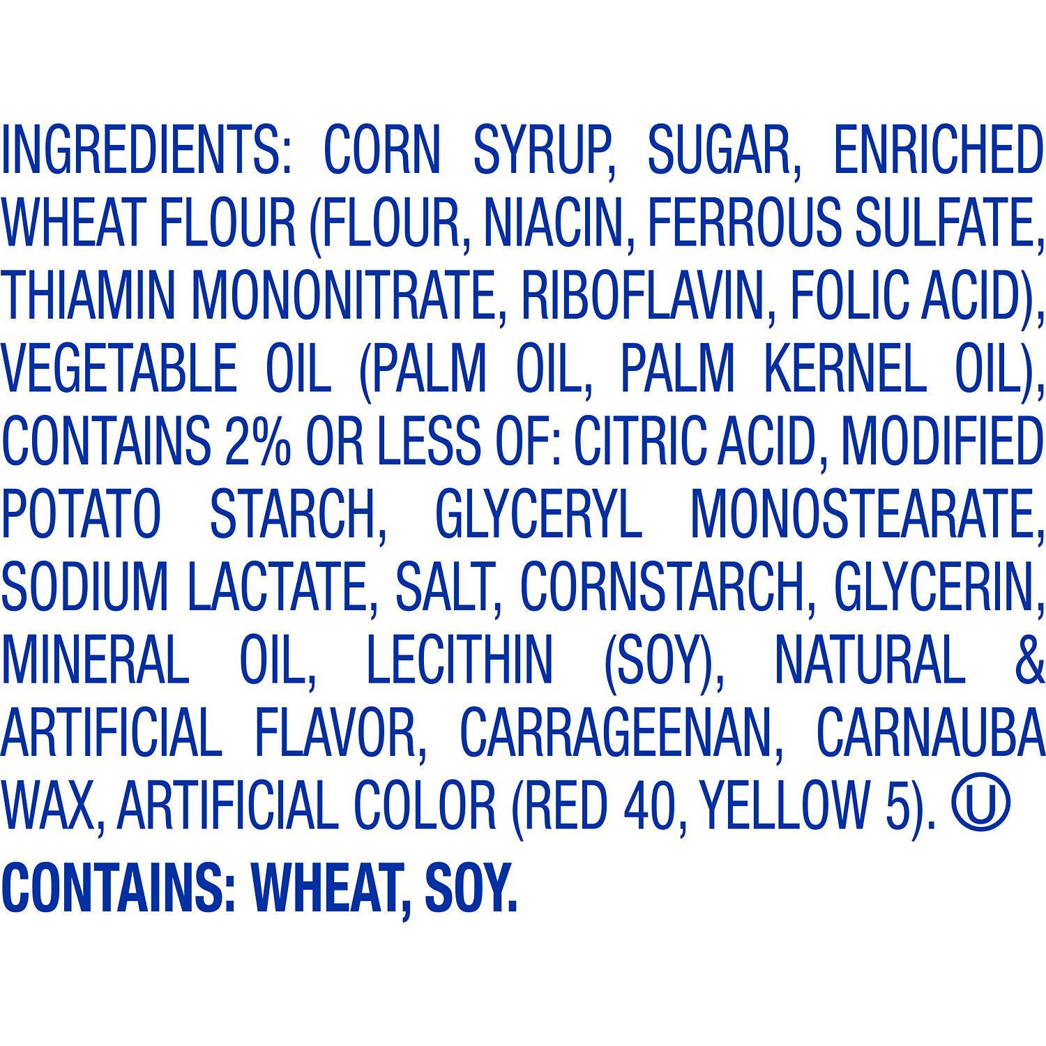 Corn Syrup, Sugar, Enriched Wheat Flour (Flour, Niacin, Ferrous Sulfate, Thiamin Mononitrate, Riboflavin, Folic Acid), Vegetable Oil (Palm Oil, Palm Kernel Oil), Contains 2% or Less of: Citric Acid, M…