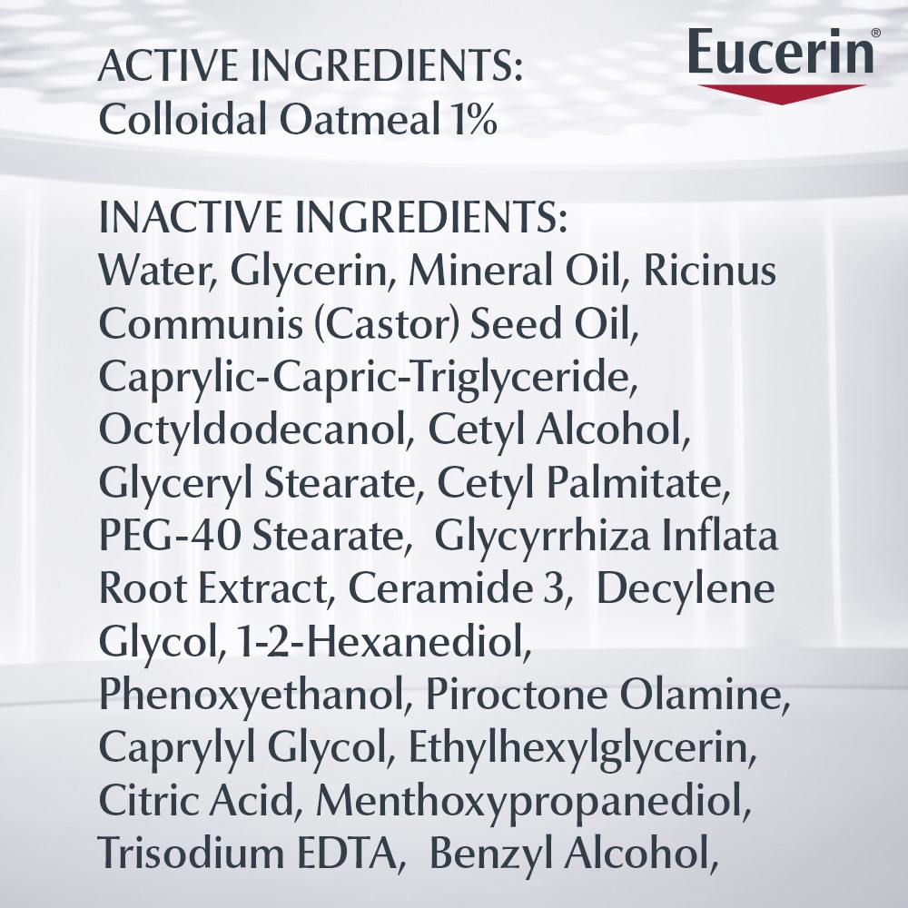 Active Ingredient: Colloidal Oatmeal 1% (Skin protectant).Inactive Ingredients: Water, Glycerin, Ricinus Communis (Castor) Seed Oil, Mineral Oil, Cetyl Alcohol, Glyceryl Stearate, Caprylic/Capric Trig…