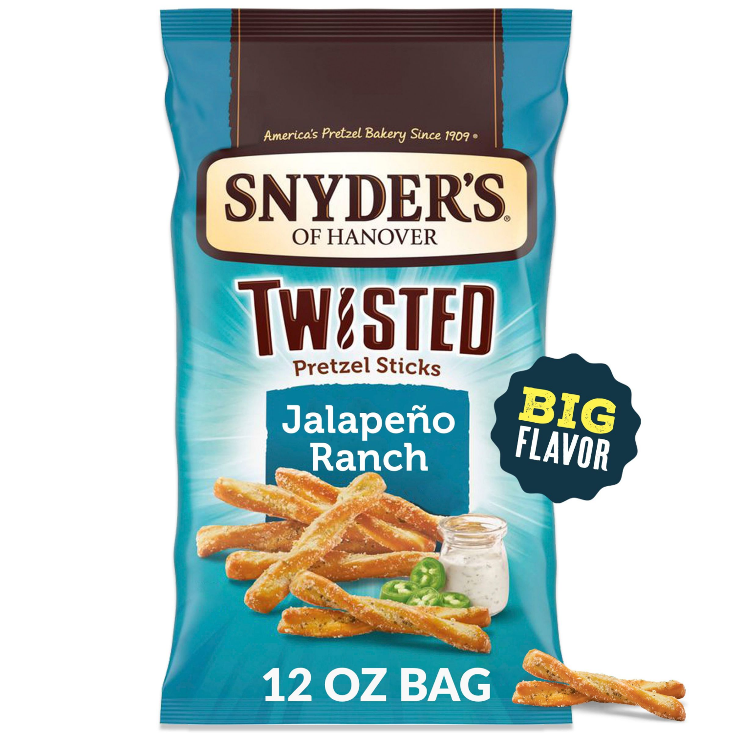 Snyder''s of Hanover Jalapeno Ranch Twisted Pretzel Sticks are generously seasoned with the spicy kick of jalapeno and balanced with smooth ranch flavor. Their BIG, irresistibly craveable flavor and l…