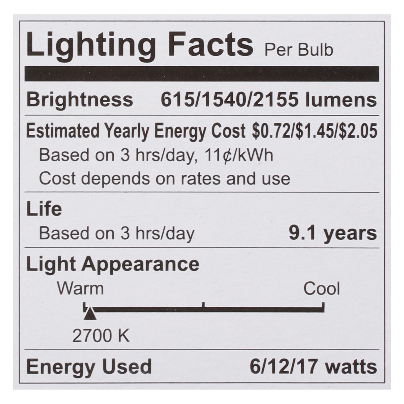 Brightness Quantity: 615 lumens; 1540 lumens; 2155 lumens. Energy Info: $0.72; $1.45; $2.05 Based on 3 hrs/day, 11 cents/kWh. Cost depends on rates and use 6 watts; 12 watts; 17 watts. Package Info: 1…