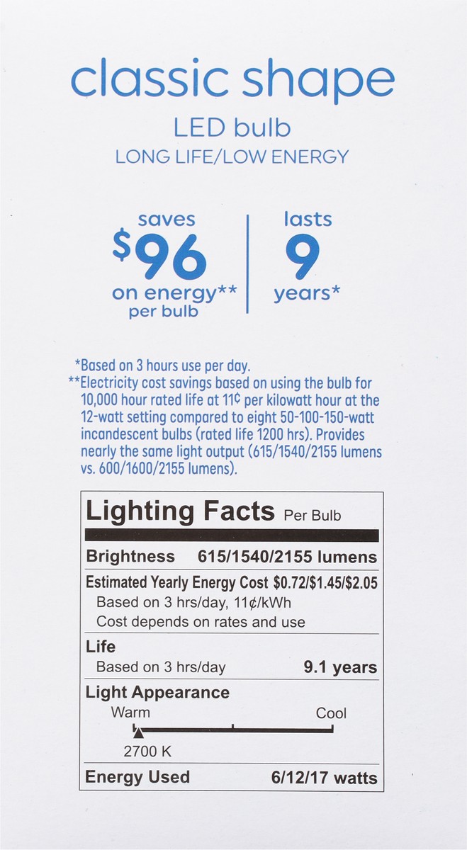 Brightness Quantity: 615 lumens; 1540 lumens; 2155 lumens. Energy Info: $0.72; $1.45; $2.05 Based on 3 hrs/day, 11 cents/kWh. Cost depends on rates and use 6 watts; 12 watts; 17 watts. Package Info: 1…