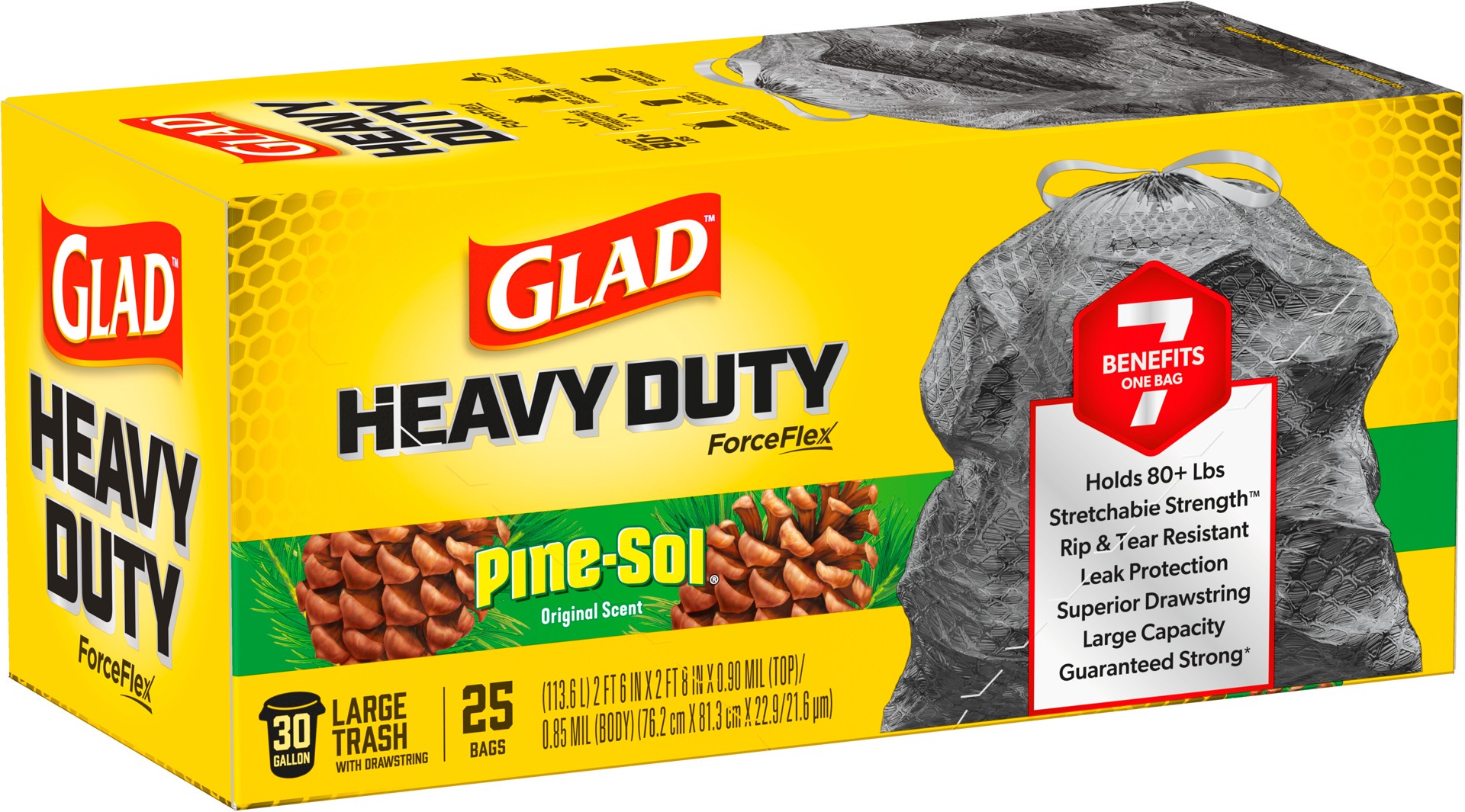Glad ForceFlex Heavy Duty Large Trash Bags in Pine-Sol Original scent are the ideal solution for all your toughest cleanup jobs, indoors or outdoors. Featuring seven benefits in one bag, these 30 gall…