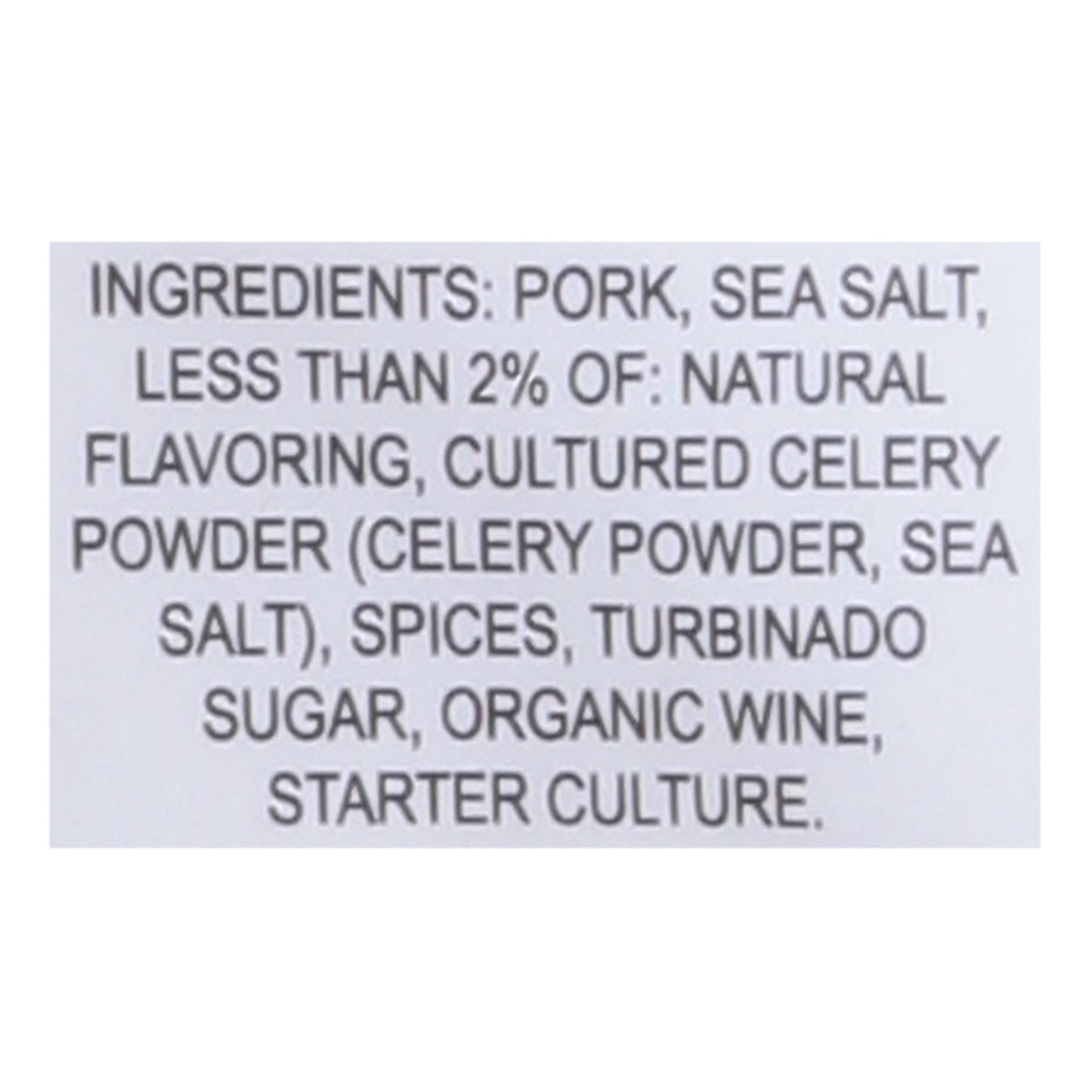 Pork, Sea Salt, Less than 2% of: Natural Flavoring, Cultured Celery Powder (Celery Powder, Sea Salt), Spices, Turbinado Sugar, Organic Wine Starter Culture.