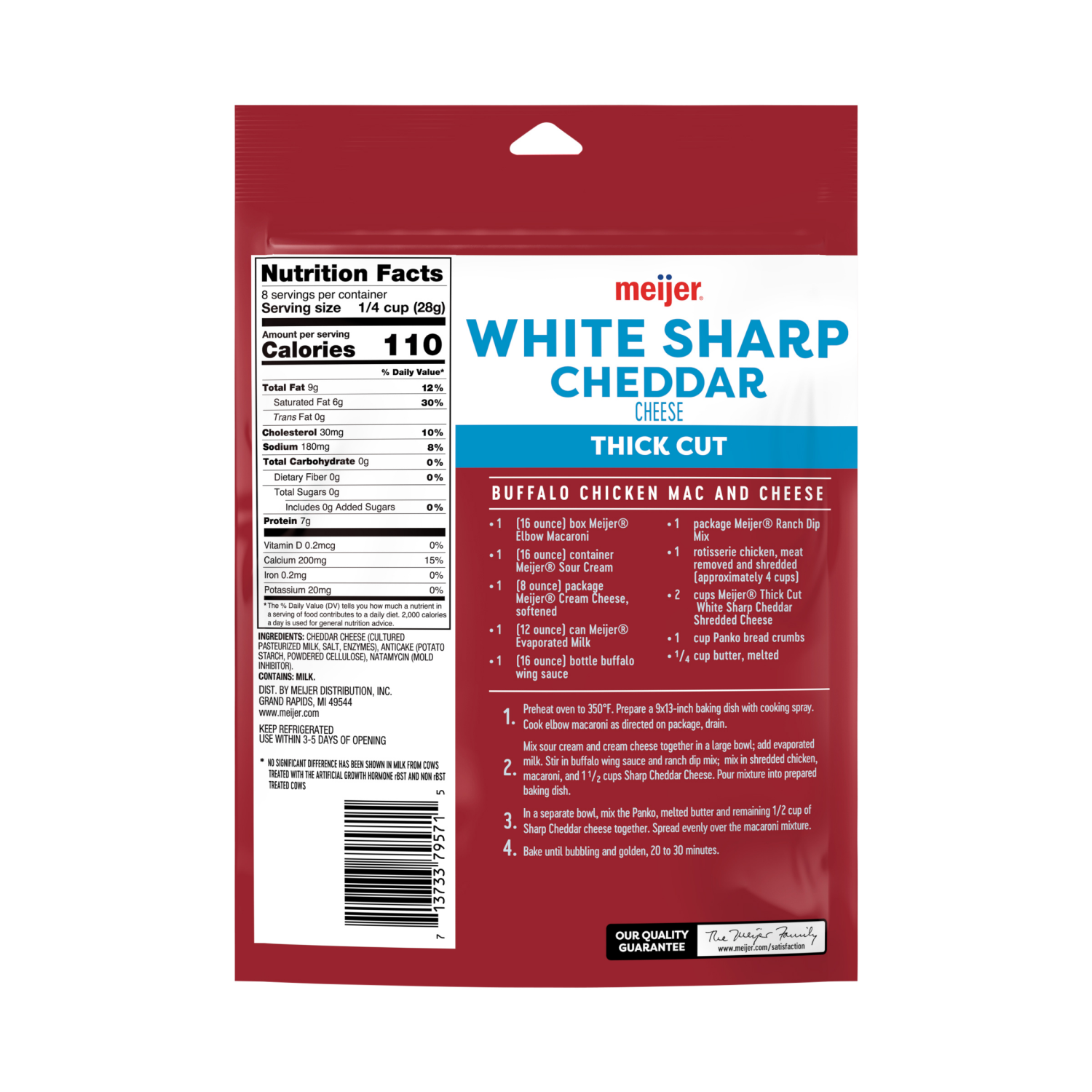 Whether you use it in Buffalo-style mac and cheese or a tasty burrito, Meijer Thick Cut Shredded Sharp Cheddar Cheese is perfect for any meal. Tangy and bold, this cheese is so good, you could eat it …