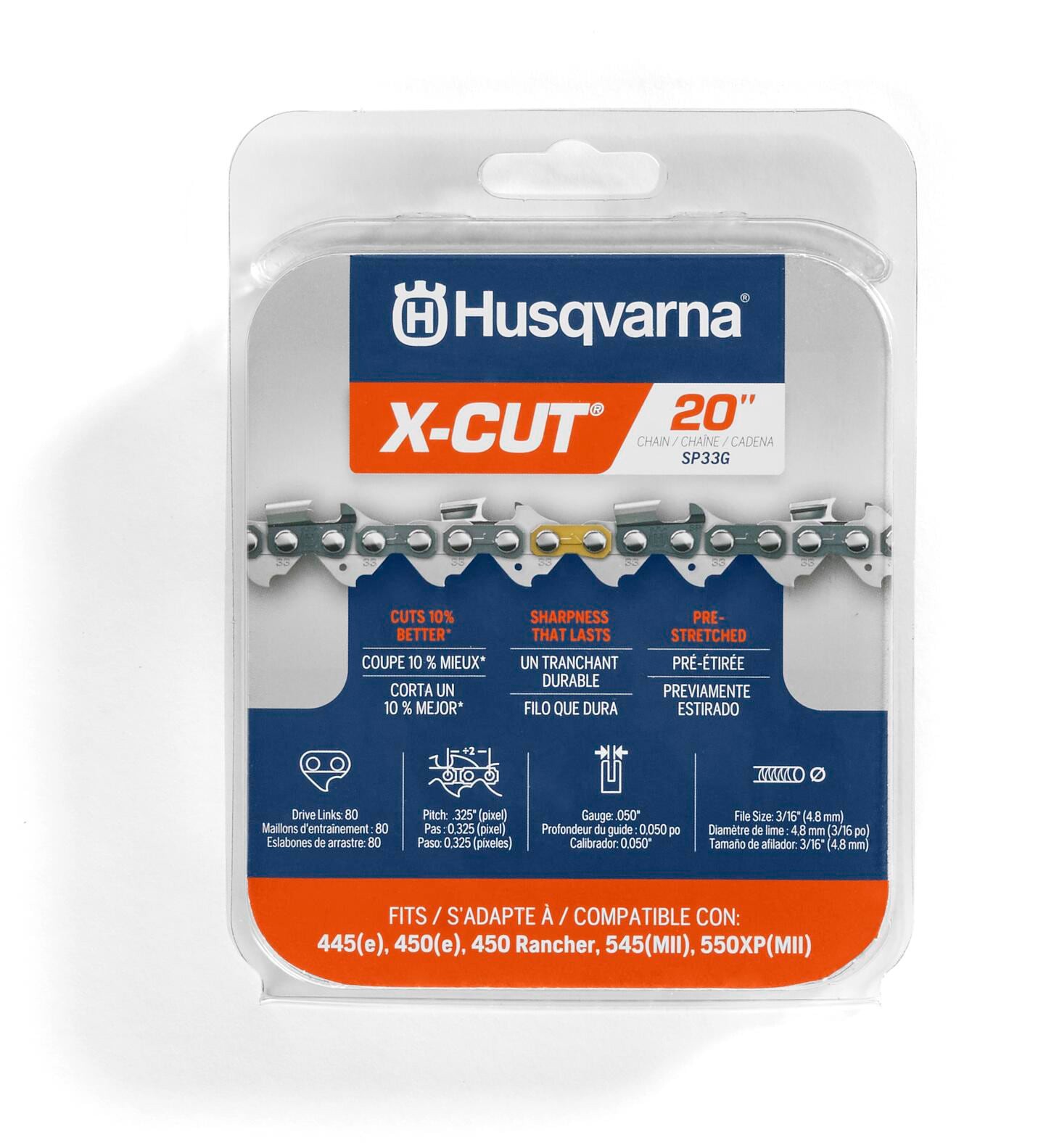 Includes one Husqvarna SP33G 20 Inch Chainsaw Chain for chainsaw models: Husqvarna 450 Rancher, 445(E), 450(E), 545(MII) and 550XP(MII). This Husqvarna 20in chain replacement provides excellent precis…
