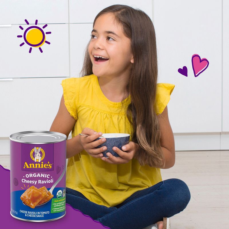 - Cheesy Ravioli: Easy and cheesy! Annie's Certified Organic Cheesy Ravioli is made with organic pasta “pillows” filled with yummy organic cheese smothered in our traditional organic tomato and cheese sauce