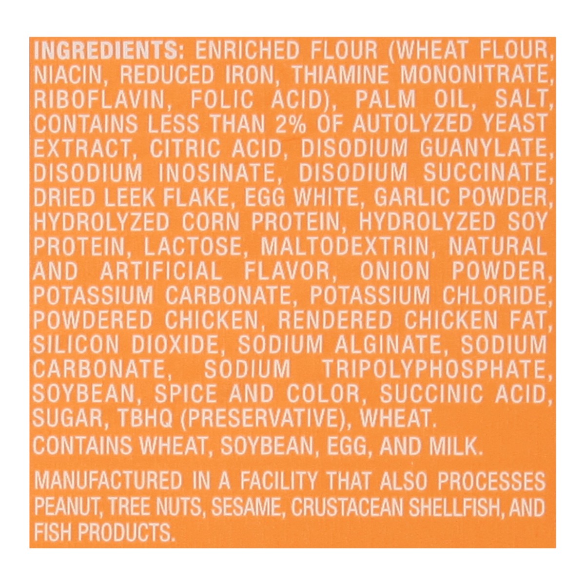 Enriched Flour (Wheat Flour, Niacin, Reduced Iron, Thiamine Mononitrate, Riboflavin, Folic Acid), Palm Oil, Salt, Contains Less than 2% of Autolyzed Yeast Extract, Citric Acid, Disodium Guanylate, Dis…