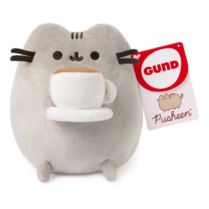 - This 6” plush shows Pusheen holding a white mug of coffee.