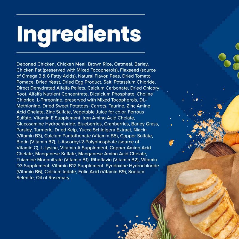 Deboned Chicken, Chicken Meal, Brown Rice, Oatmeal, Barley, Chicken Fat (Preserved with Mixed Tocopherols), Flaxseed (Source of Omega 3 & 6 Fatty Acids), Natural Flavor, Peas, Dried Tomato Pomace, Dri…