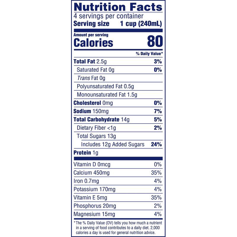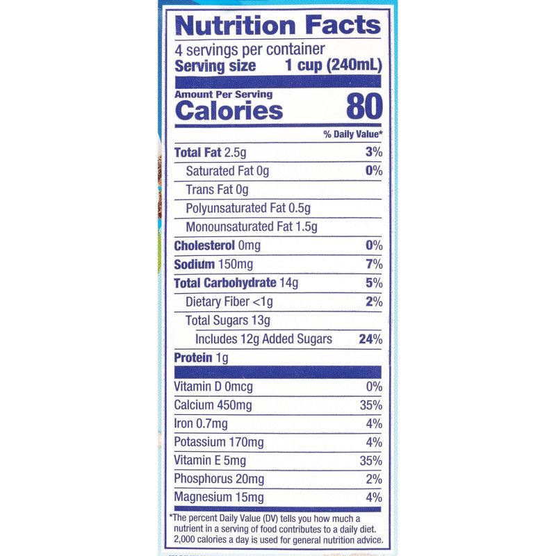 Almondmilk (Filtered Water, Almonds), Cane Sugar, Calcium Carbonate, Natural Flavors, Sea Salt, Potassium Citrate, Sunflower Lecithin, Gellan Gum, D-Alpha-Tocopherol (Natural Vitamin E).