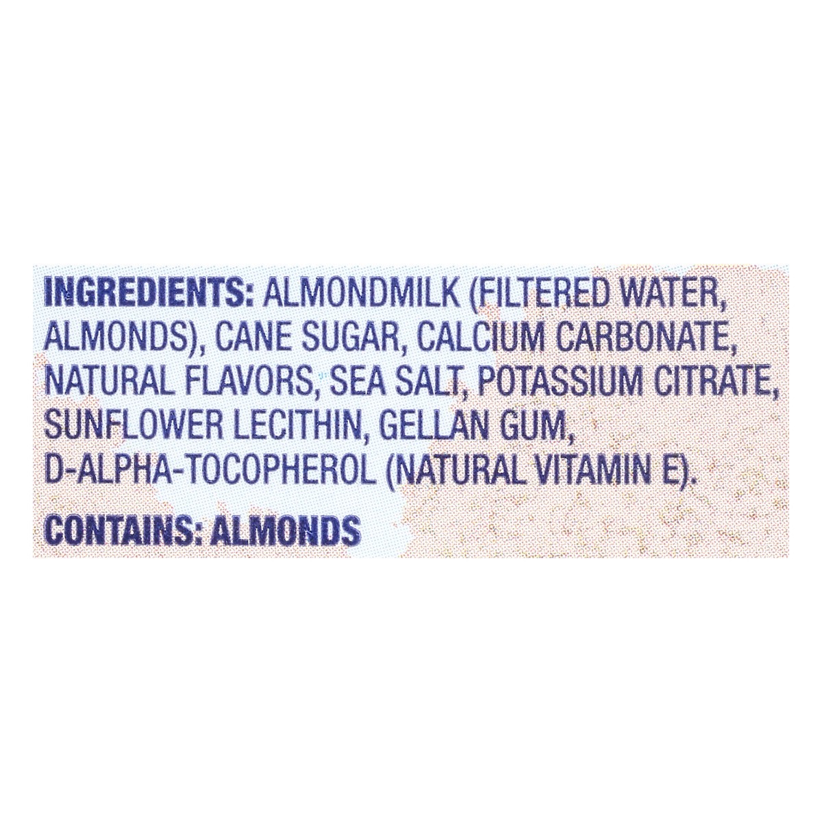 ALMONDMILK (FILTERED WATER, ALMONDS), CANE SUGAR, CALCIUM CARBONATE, NATURAL FLAVORS, SEA SALT, POTASSIUM CITRATE, SUNFLOWER LECITHIN, GELLAN GUM, D-ALPHA-TOCOPHEROL (NATURAL VITAMIN E).