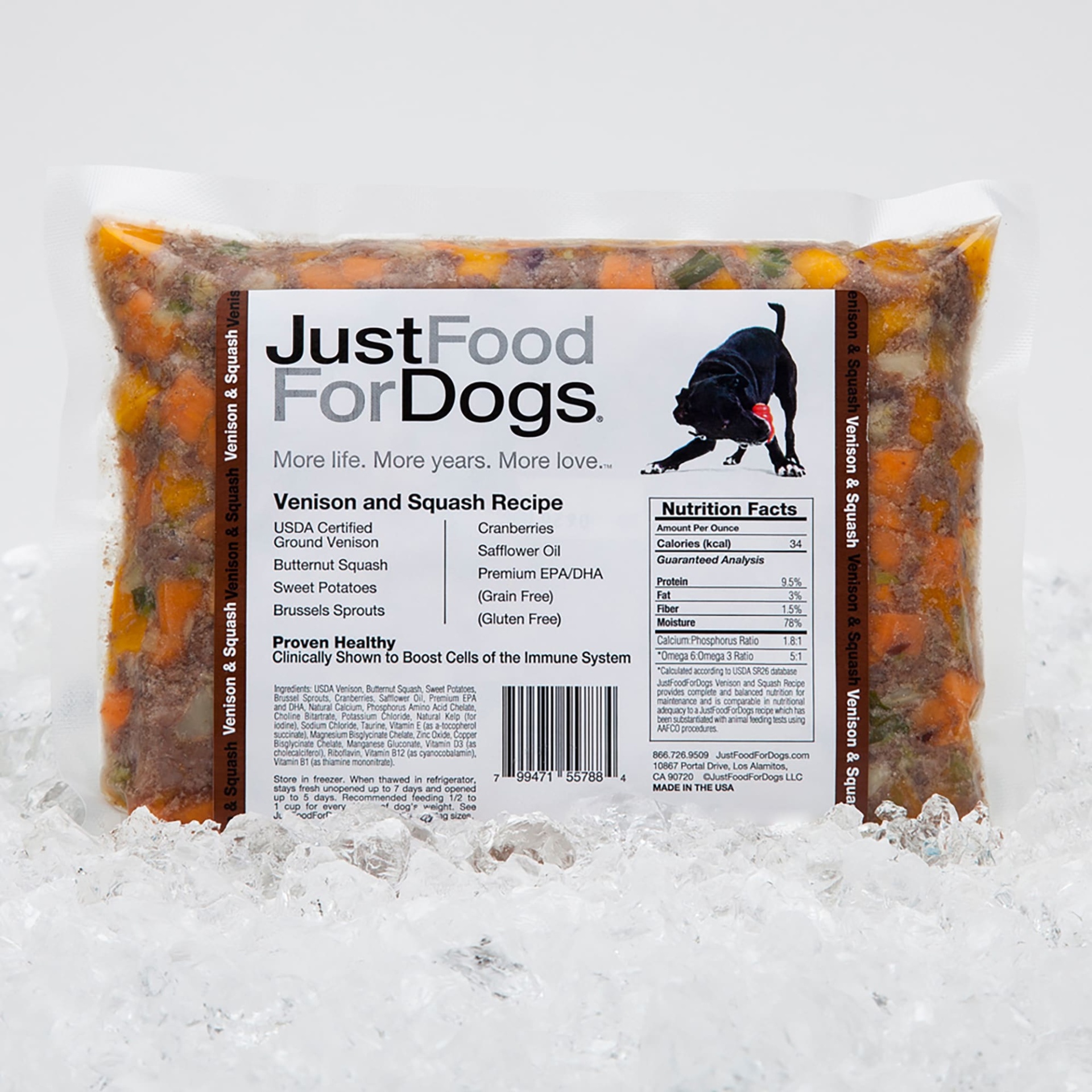 USDA Certified Ground Venison, Butternut Squash, Sweet Potatoes, Brussels Sprouts, Cranberries, Safflower Oil, Premium EPA/DHA Natural Calcium, Dicalcium Phosphate Dihydrate, Potassium Chloride, Choli…