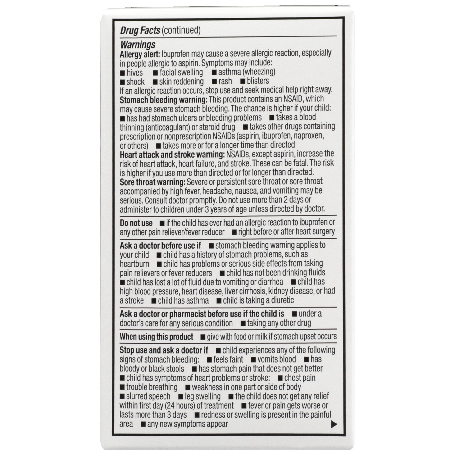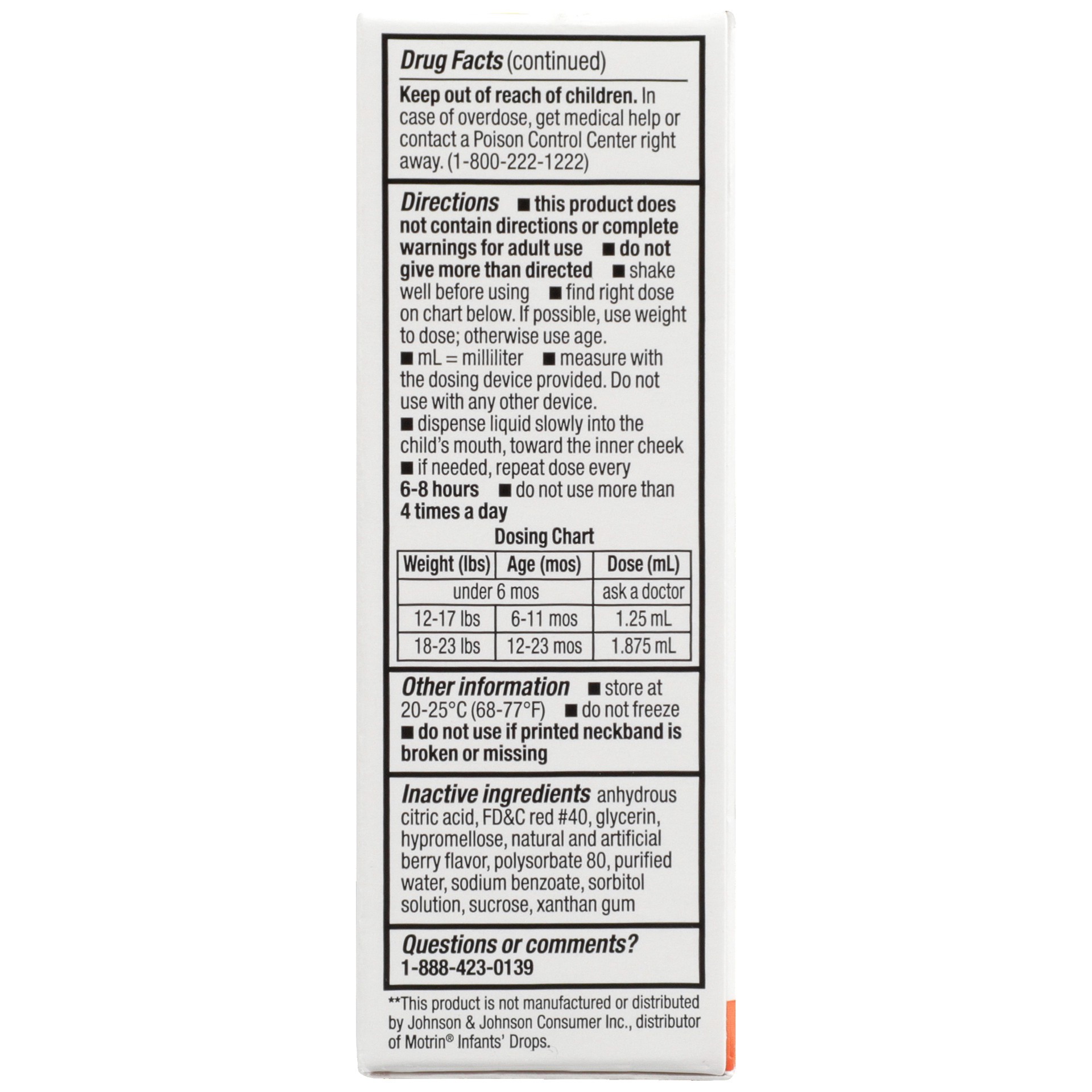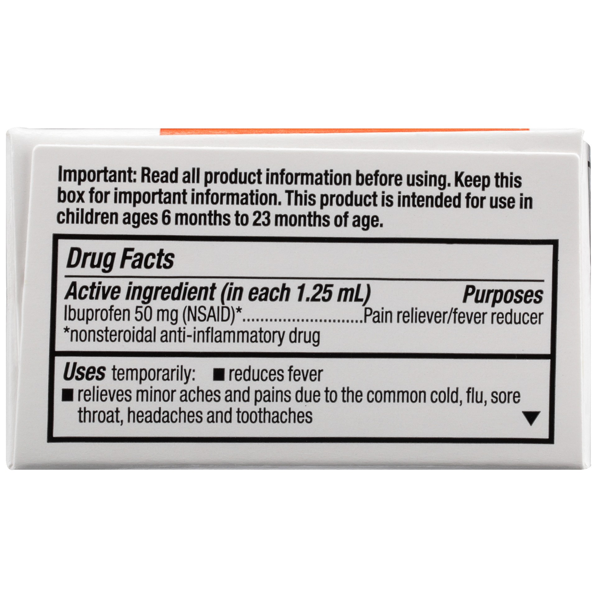 In Each 1.25 mL: Active Ingredients: *Ibuprofen (NSAID) (50 mg), Pain Reliever/Fever Reducer. Inactive Ingredients: Anhydrous Citric Acid, FD&C Red #40, Glycerin, Hypromellose, Natural and Artificial …