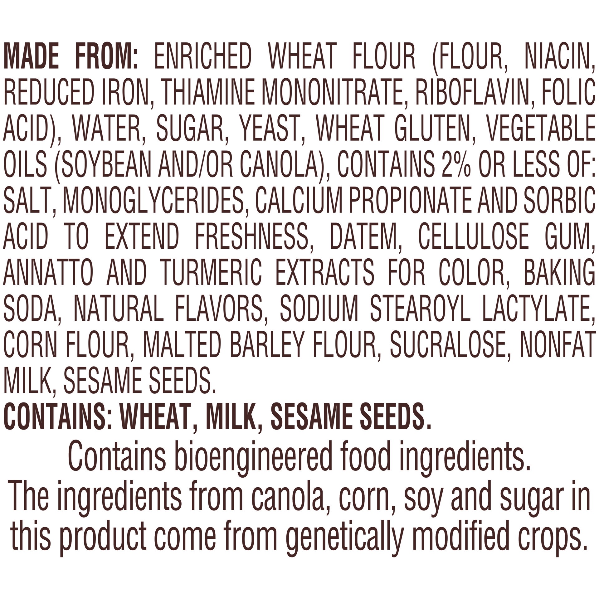 MADE FROM: ENRICHED WHEAT FLOUR (FLOUR, NIACIN, REDUCED IRON, THIAMINE MONONITRATE, RIBOFLAVIN, FOLIC ACID), WATER, SUGAR, YEAST, WHEAT GLUTEN, VEGETABLE OILS (SOYBEAN AND/OR CANOLA), CONTAINS 2% OR L…