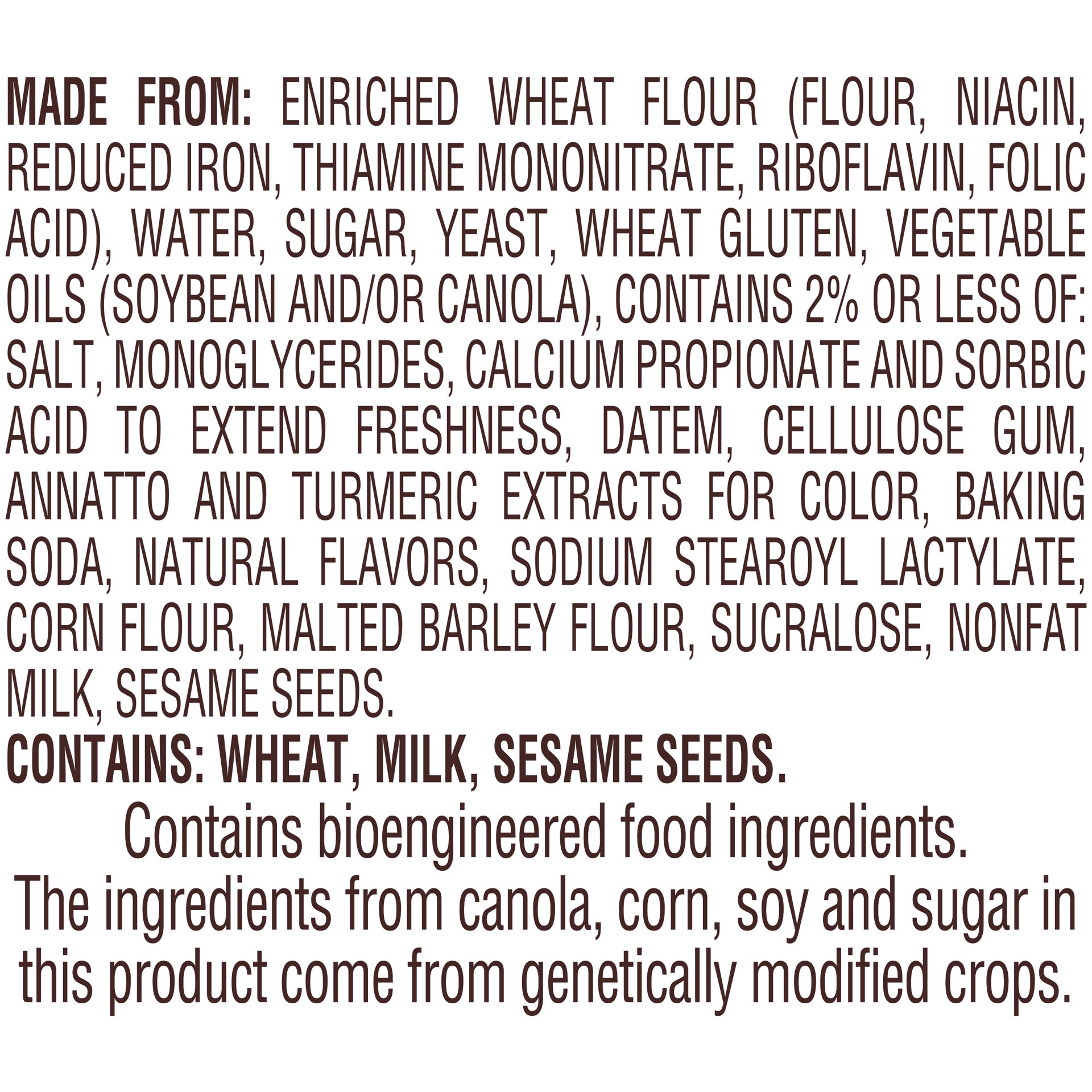 MADE FROM: ENRICHED WHEAT FLOUR (FLOUR, NIACIN, REDUCED IRON, THIAMINE MONONITRATE, RIBOFLAVIN, FOLIC ACID), WATER, SUGAR, YEAST, WHEAT GLUTEN, VEGETABLE OILS (SOYBEAN AND/OR CANOLA), CONTAINS 2% OR L…