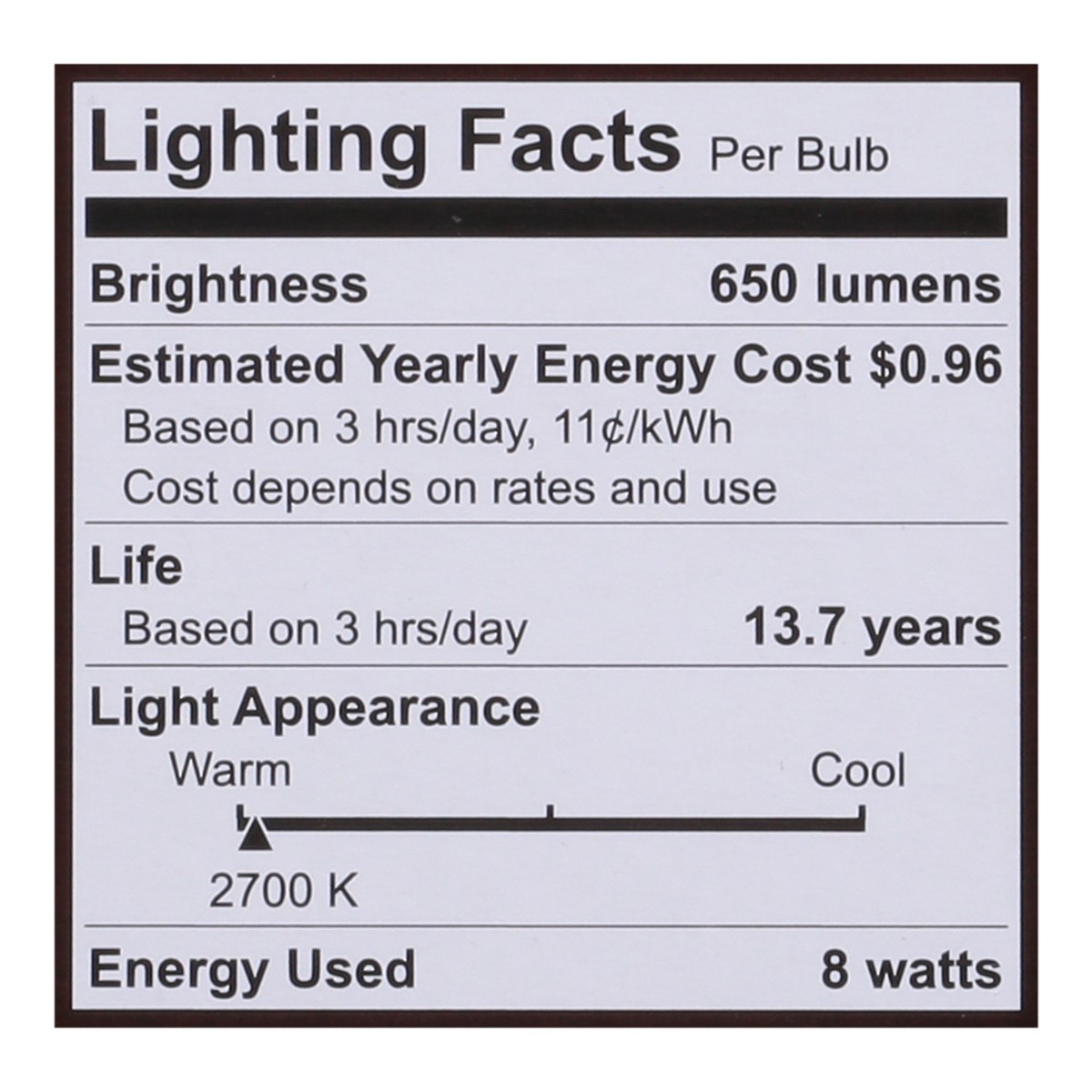 Brightness Quantity: 650 lumens. Energy Info: $0.96 Based on 3 hrs/day, 11 cents/kWh. Cost depends on rates and use. 8 watts. Package Info: 2. Voltage: 120 . Bulb Info: LED. Is Dimmable. Has Energy St…