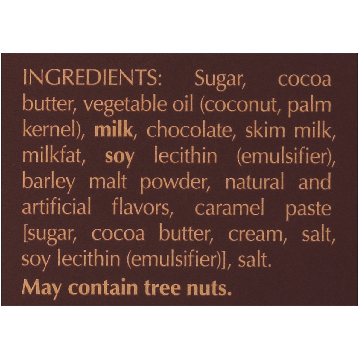 Sugar, Cocoa Butter, Vegetable Oil (Coconut, Palm Kernel), Milk, Chocolate, Skim Milk, Milkfat, Soy Lecithin (Emulsifier), Barley Malt Powder, Natural and Artificial Flavors, Caramel Paste [Sugar, Coc…