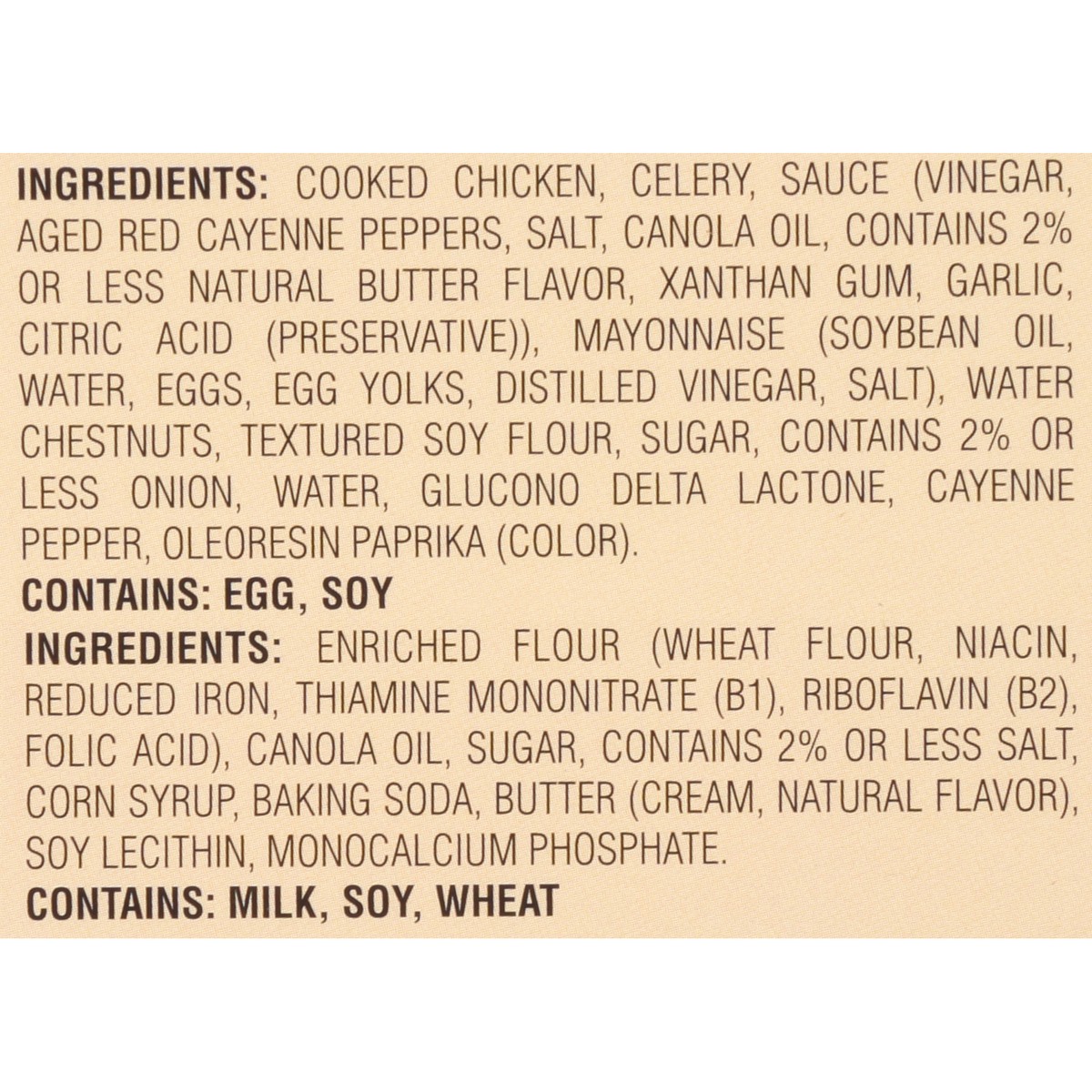 Buffalo Style Chicken Salad: Cooked Chicken, Celery, Sauce (Cayenne Peppers, Distilled Vinegar, Salt, Canola Oil, Natural Flavor, Xanthan Gum, Garlic, Citric Acid), Mayonnaise (Soybean Oil, Water, Egg…