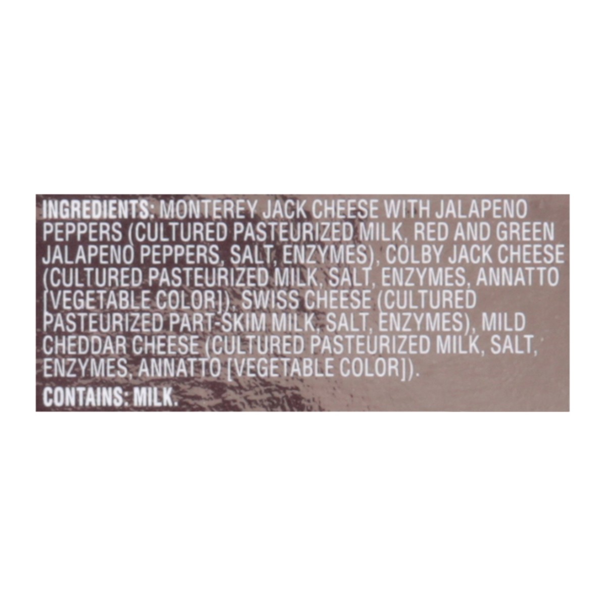 Mild Cheddar Cheese: Monterey Jack Cheese with Jalapeno Peppers (Cultured Pasteurized Milk, Red and Green Jalapeno Peppers, Salt, Enzymes), Colby Jack Cheese (Cultured Pasteurized Milk, Salt, Enzymes,…