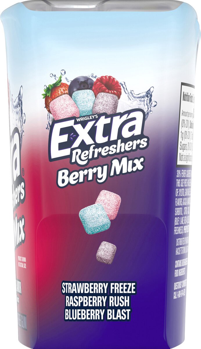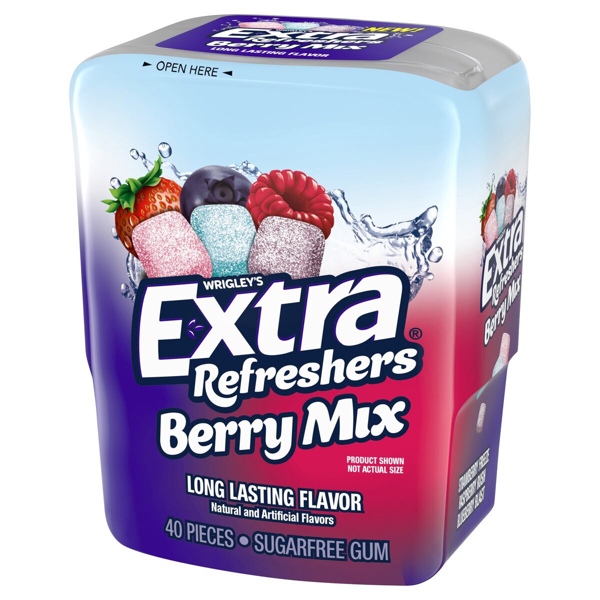 Contains one (1) 40-piece bottle of EXTRA Refreshers Berry Mix Gum Enjoy a variety of 3 flavors in each easily opened and closed bottle featuring strawberry freeze, raspberry rush, blueberry blast Exp…