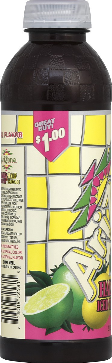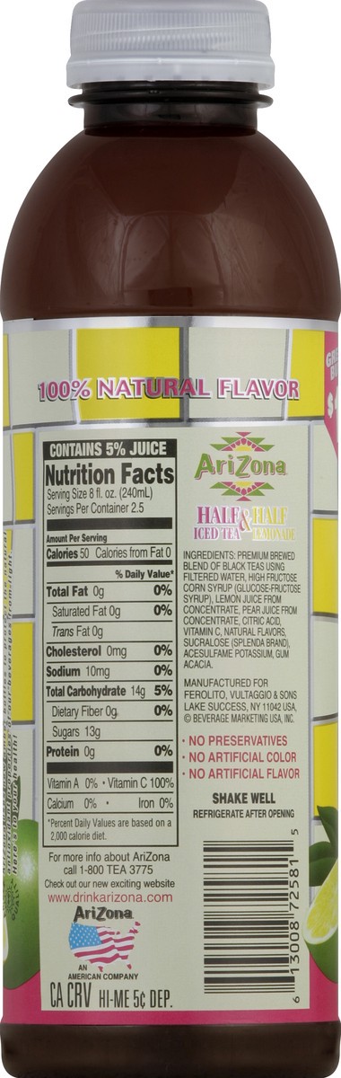 100% natural flavor. Contains 5% juice. No preservatives. No artificial color. No artificial flavor. Arizona uses new amber bottles to protect the natural antioxidant properties of our beverage from l…